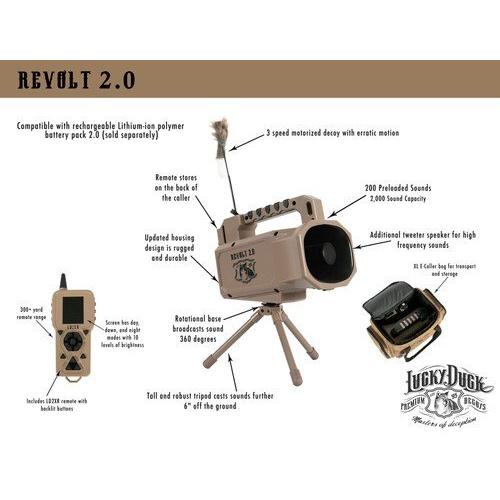 The Revolt 2.0 took everything you came to love about the original and made it that much more effective. Featuring the LD2XR remote, an extended range of 300+ yards can now be reached. Get ready to turn up the volume with high output speakers. With unmatched sound quality and ear-piercing volume, you will be able to call to even the farthest of coyotes. The remote controlled rotational base broadcasts sound 360 degrees. The erratic 3-speed motorized decoy draws coyotes close, and stores conveniently on the call. Transport and store your caller and accessories with the included XL E Caller bag. The Revolt 2.0 has 200 preloaded sounds (capacity of 2000). These live animal sounds have been compiled by The Verminator, Rick Paillet. The caller runs on an included 10 AA battery cartridge (batteries not included). The remote runs on 3 AA's batteries (not included).