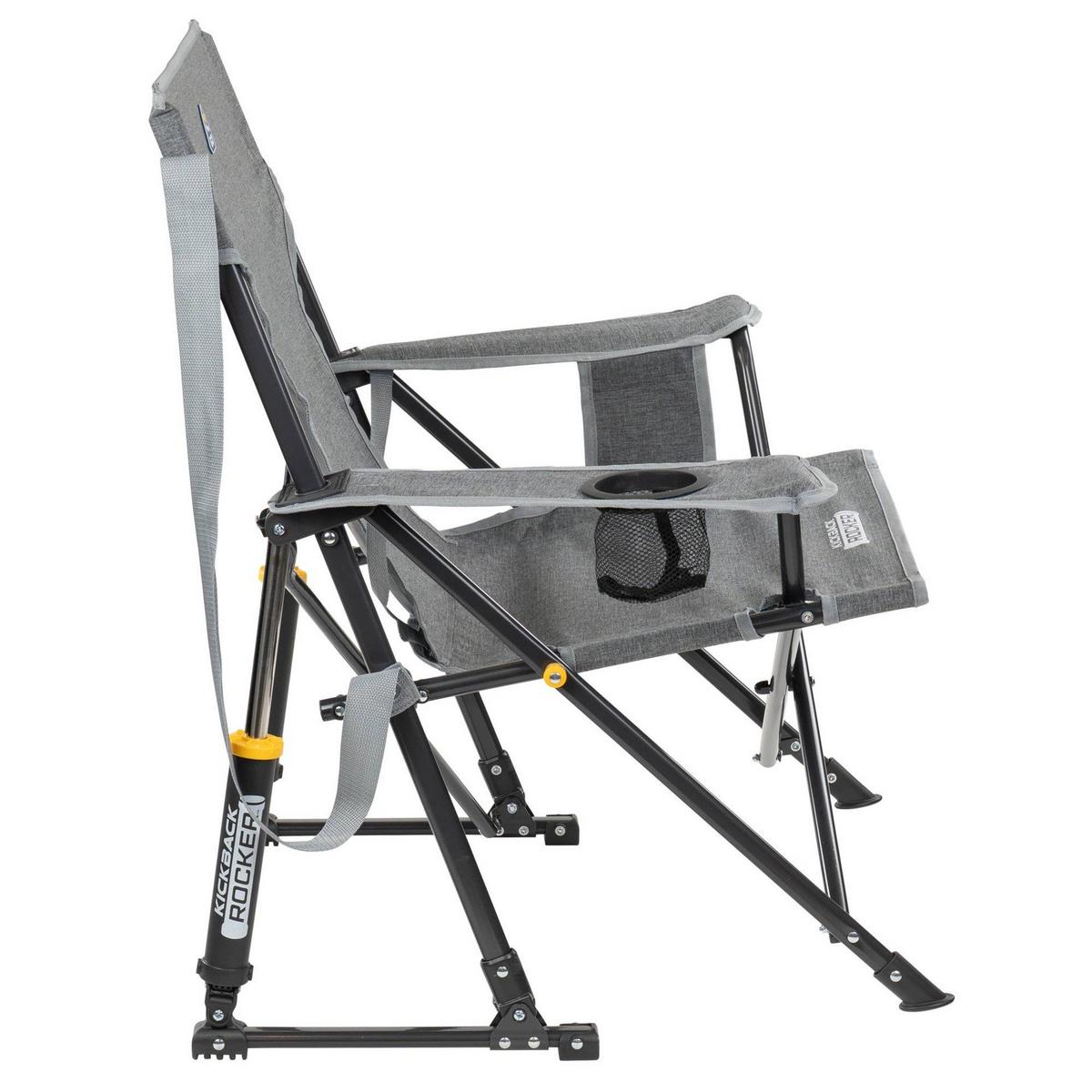 Kick back and relax with the GCI Outdoor Kickback Rocker™, the mid-size chair designed for ultimate portability and comfort. This rocker sits lower than standard chairs, offering a more relaxed sitting position while providing smooth, effortless movement on any terrain thanks to the patented Spring-Action Rocking Technology™. With a durable 250 pound capacity, the chair includes a convenient built-in carry strap for easy transport, along with a beverage holder and phone pocket for essential comfort anywhere you go.