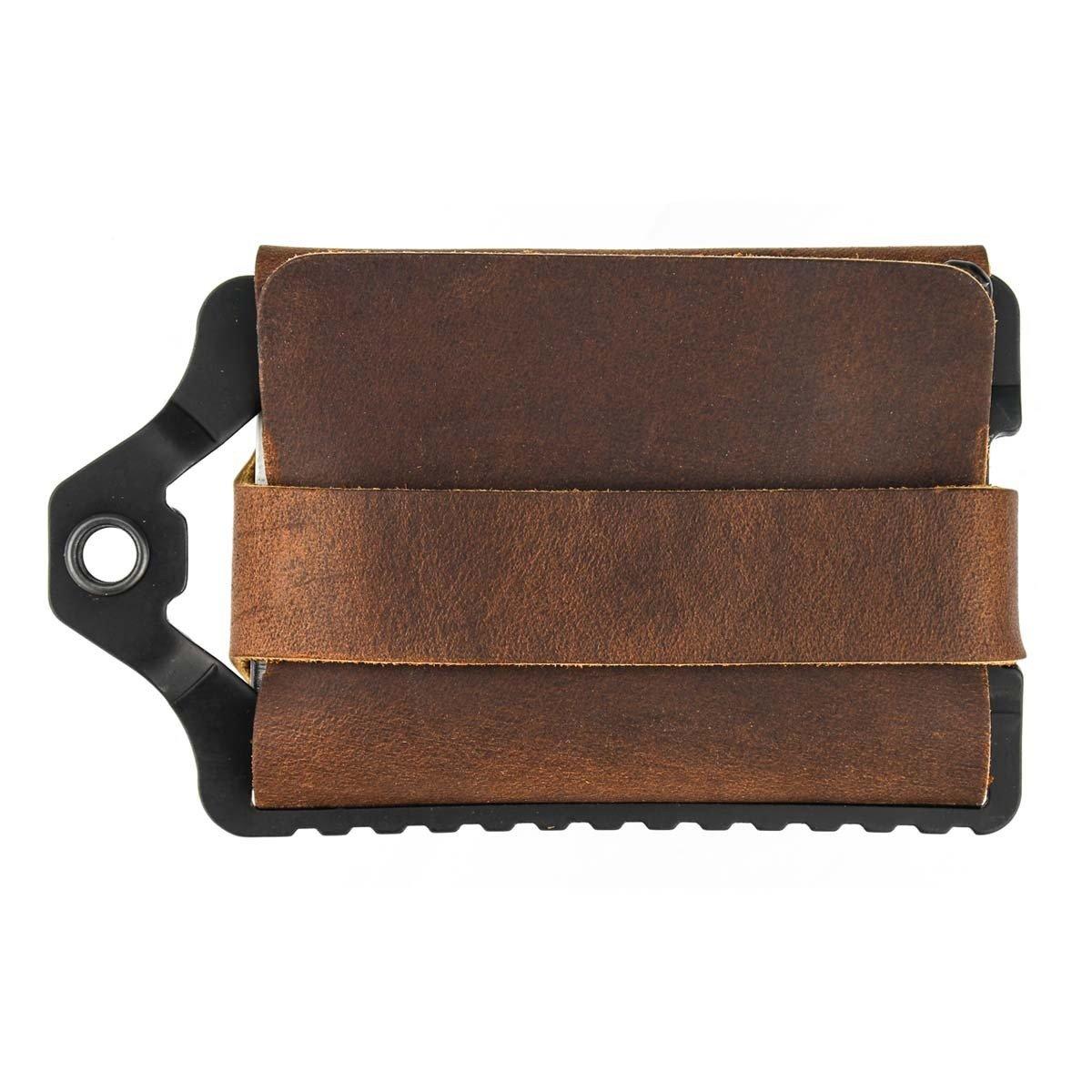 Keep your money, credit cards, and ID easily accessible and protected from RFID chip readers with this cool and stylish Trayvax Element card case wallet. This sleekly modern skinny wallet features a card selection window and can hold up to 3 to 10 credit cards, and has an integrated money clip which can hold up to 1 to 5 cash bills. This minimal wallet is constructed with a slim stainless steel frame which provides protection from RFID chip readers. The Trayvax simple wallet also features oil tanned top-grain leather, and a durable melonite finish, making this mens and womens cardholder wallet built for long-lasting reliability. The minimalistic leather wallet is small enough to be easily kept in a front pocket while you travel, and also features a built-in bottle opener, attachment point, and is secured with MIL-SPEC paracord. This RFID protective wallet is proudly made in Washington State and is backed by Trayvax's 65 year warranty.