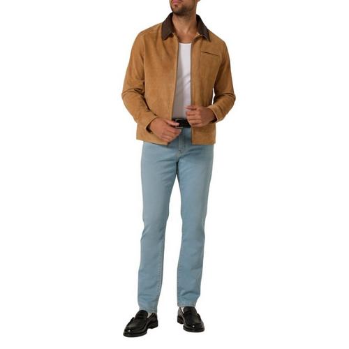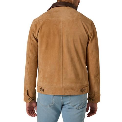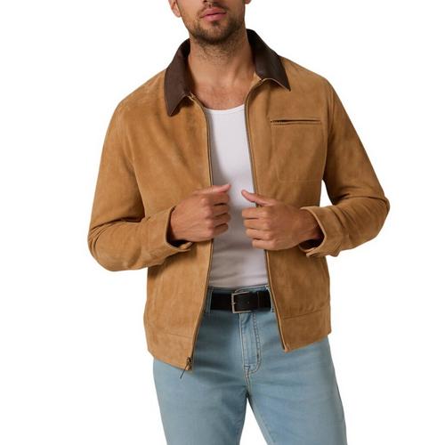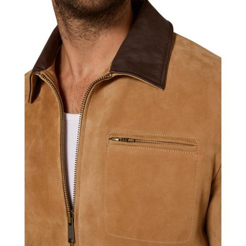 Crafted from sustainable calf suede with a top grain leather collar, this classic fit piece reimagines a timeless silhouette. Finished with angled slant pockets, a belted hem, and a rich brass zipper, it balances heritage styling with refined edge.