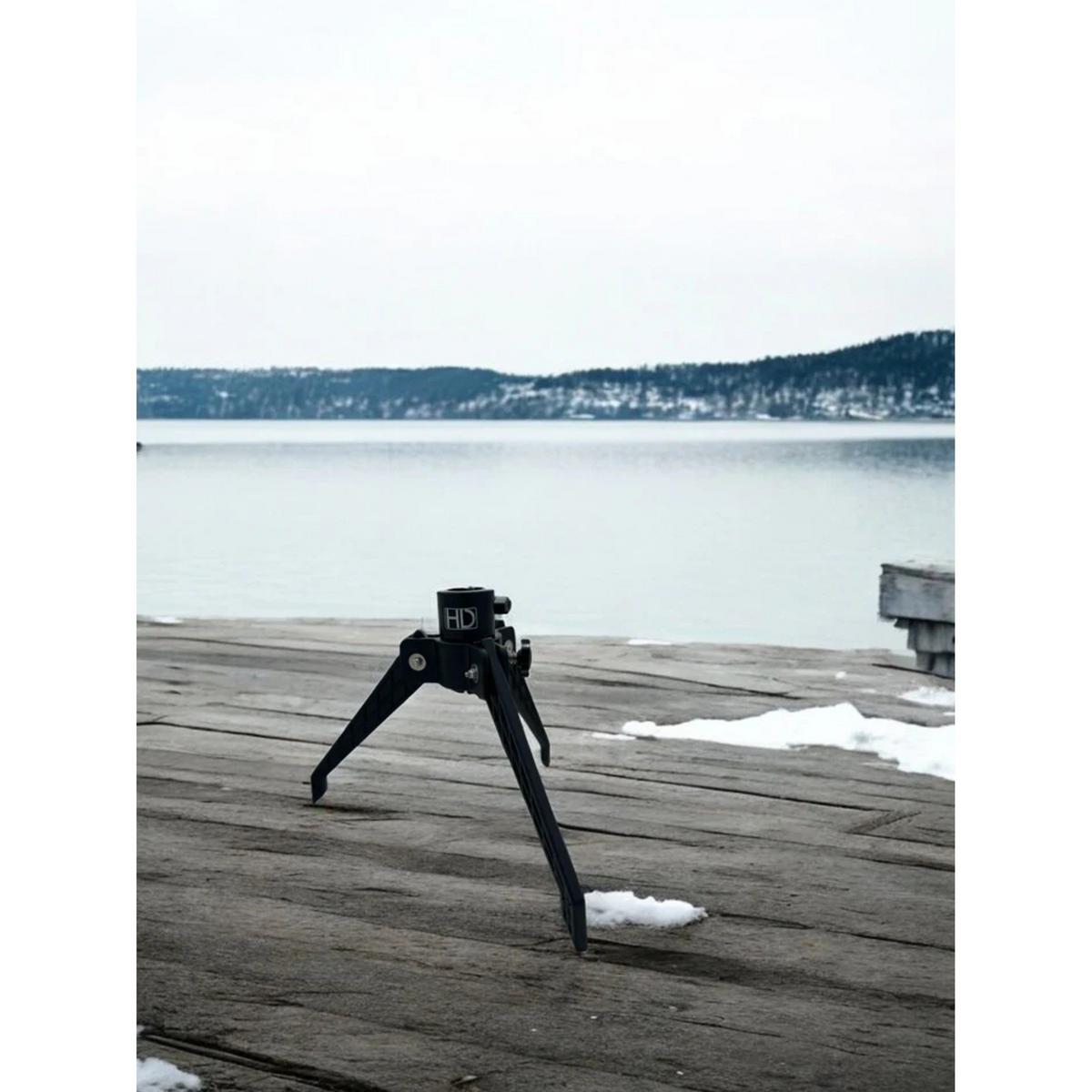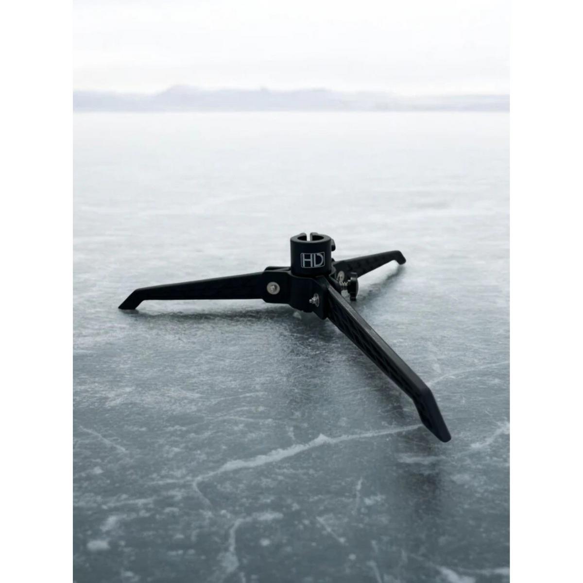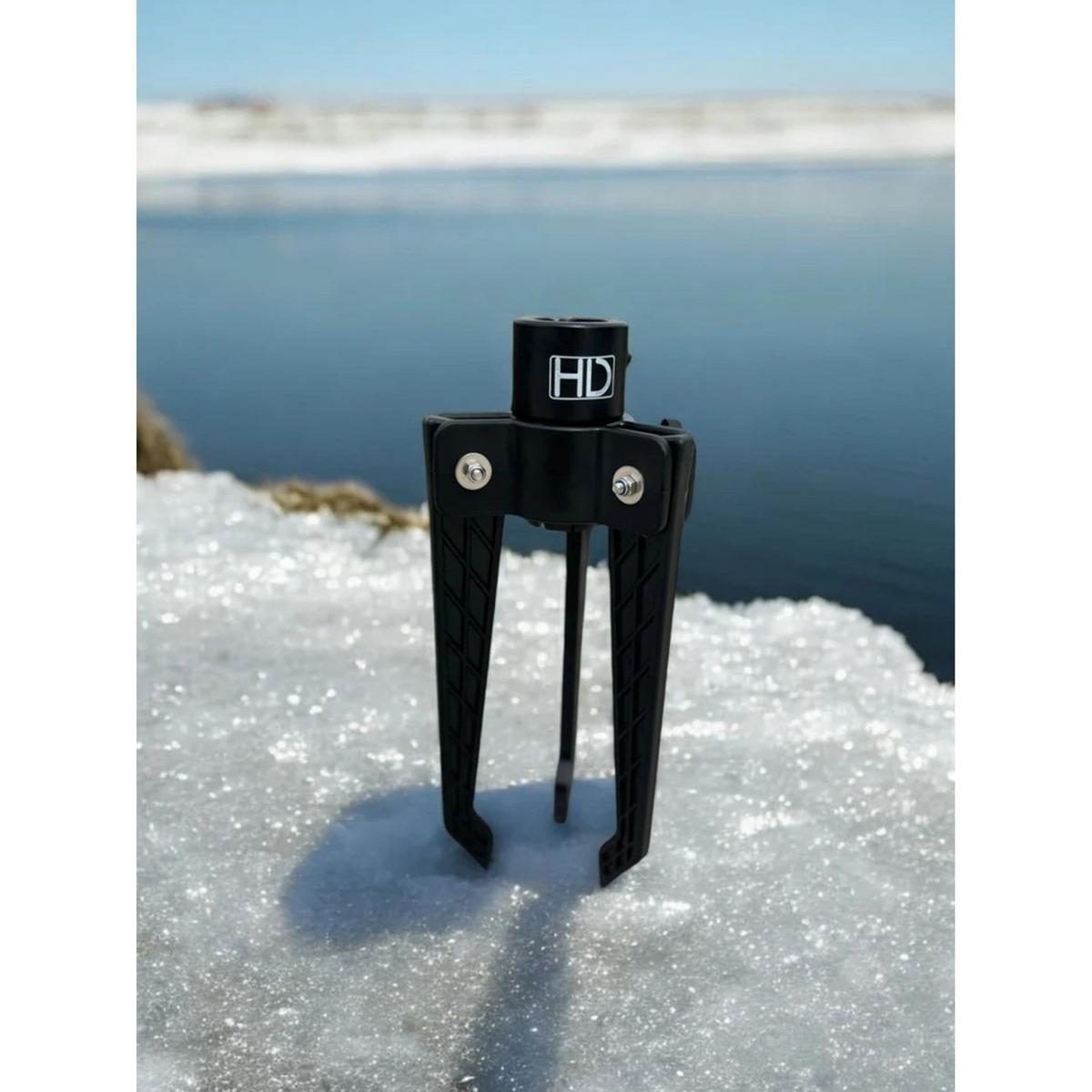 The Point and Lock tripod by HD is constructed with injection-molded glass-filled nylon for durability. Its adjustable tension legs effortlessly span holes up to 16", with a clip-in center for smooth rotation and secure attachment. This tripod's ability to lock in position is essential for ice fishing success. Once you've located your target, tighten the knob against the internal stainless ball bearing, and you're ready to drill right on the fish!