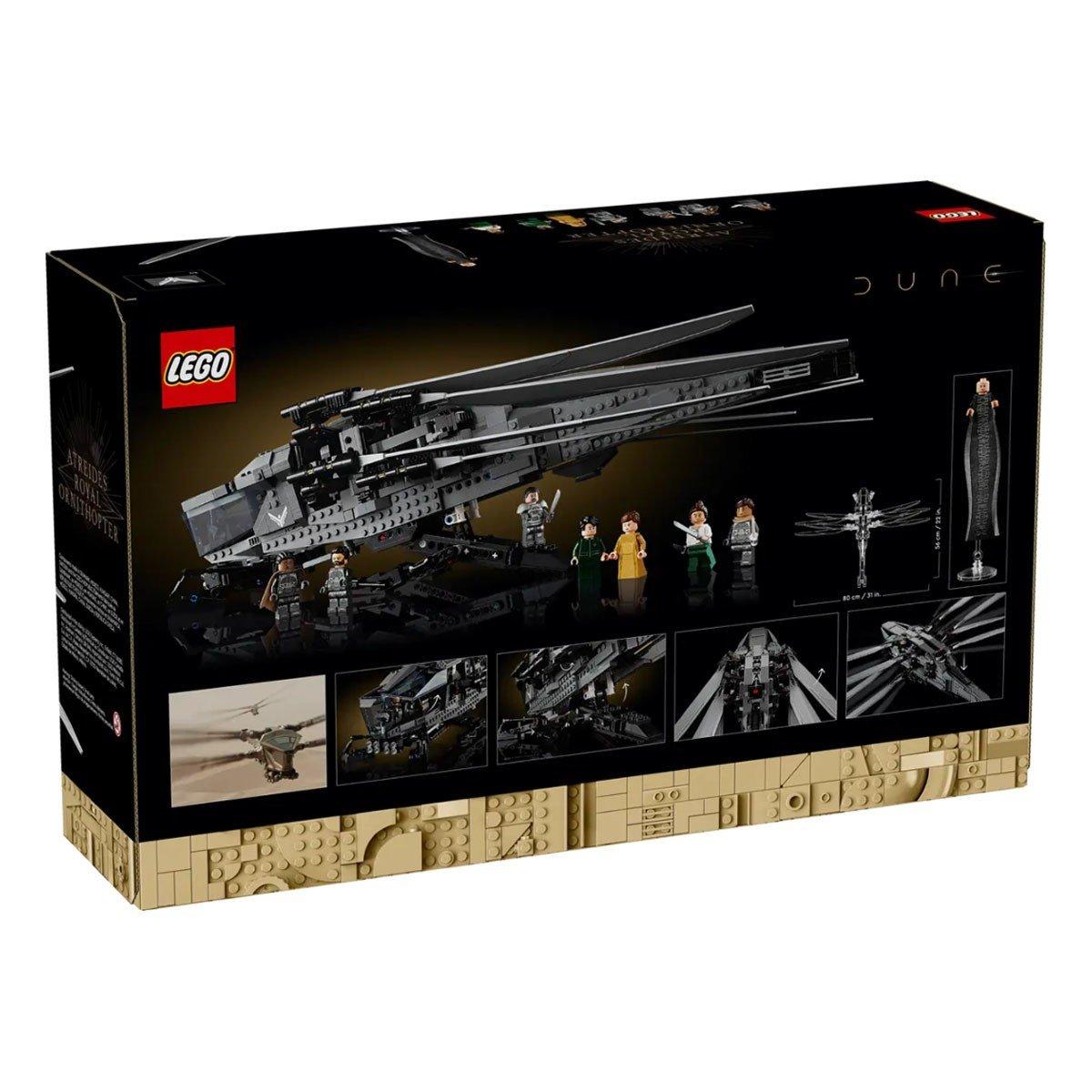 This premium-quality replica features fold-out, flappable wings, deployable landing gear and an opening cockpit. The set also includes 8 iconic characters from the movie: Paul Atreides, Lady Jessica, Gurney Halleck, Chani, Leto Atreides, Liet Kynes, Duncan Idaho and Baron Harkonnen in his long robe.