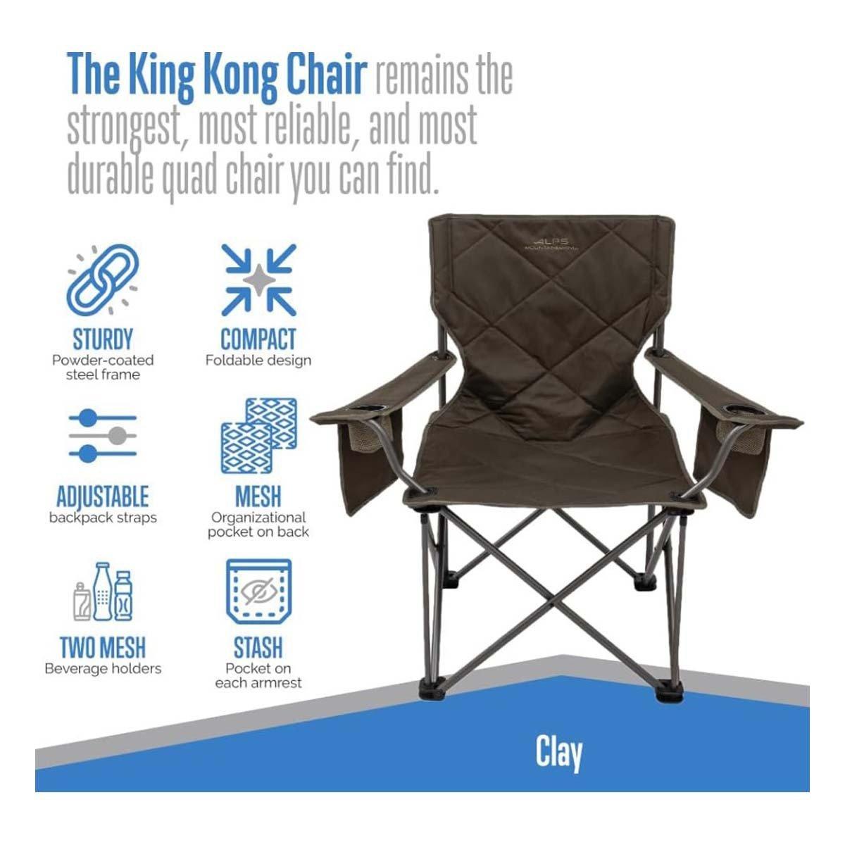 The ALPS Mountaineering King Kong Chair remains the strongest, most reliable, and durable quad chair you can find. It boasts a sturdy powder-coated steel frame with 600D polyester fabric — quality you can count on to last a lifetime — we guarantee it. The King Kong holds up to 800 lbs., and even if you're a person who doesn't need the extra weight capacity, the comfort and strength that you'll gain from this chair is incomparable to any other chair on the market that folds up, fits in a carry bag, and can be conveniently brought to all your events. The King Kong is offered in multiple color options.