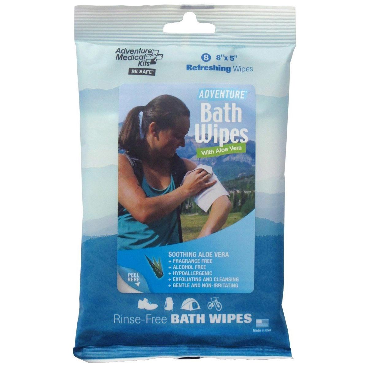 Adventure® Bath Wipes feature thick soft and gentle pre-moistened towels to clean disinfect and deodorize the body. Each wipe contains a unique formula that includes Aloe Vera Vitamin E and Witch Hazel Astrigent that will leave skin feeling refreshed and moisturized. Adventure Bath Wipes are great for camping backpacking hiking bike riding and all other outdoor activities. 8 8" x 5" wipes per package.