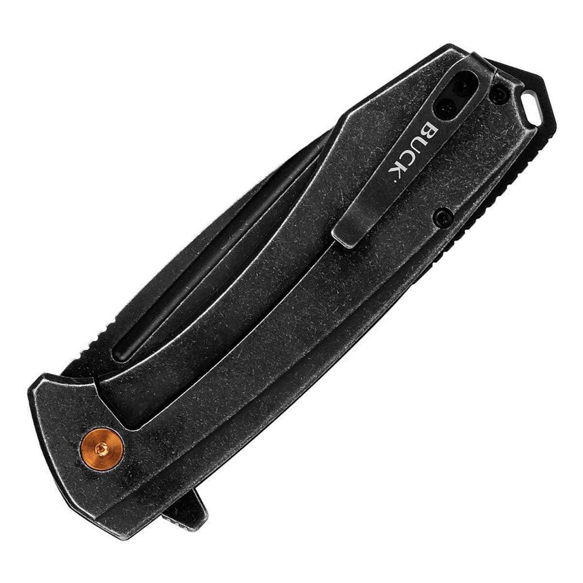 Buck Knives 713 Ruckus with black stonewash finish D2 tool steel and anodized aluminum handles.