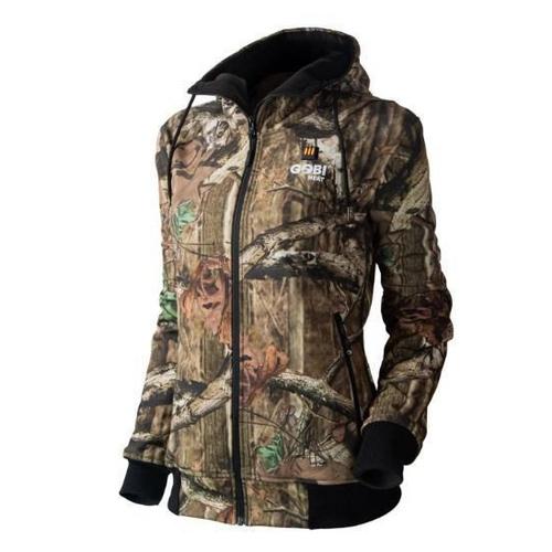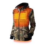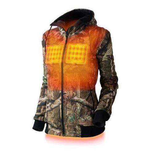 Get ready for the hunt with the Shadow soft-shell women's heated camo hoodie. Official Mossy Oak® Break up pattern. It is wind, water, and abrasion resistant and allows you to control your body temperature with three heat settings: Low, Medium, and High. Also, this jacket has three heat zones in the most effective locations, two zones in the chest and a large zone in the back.