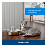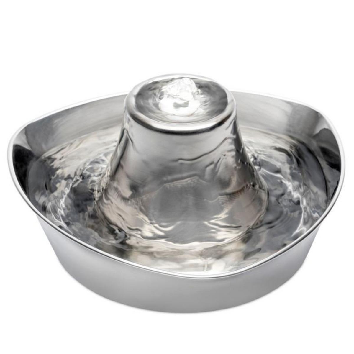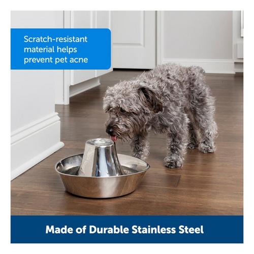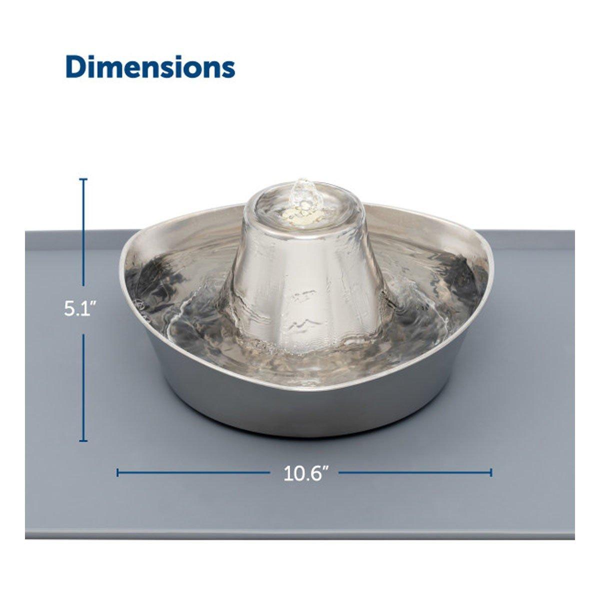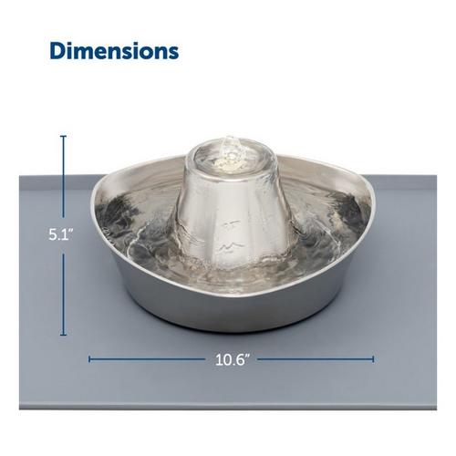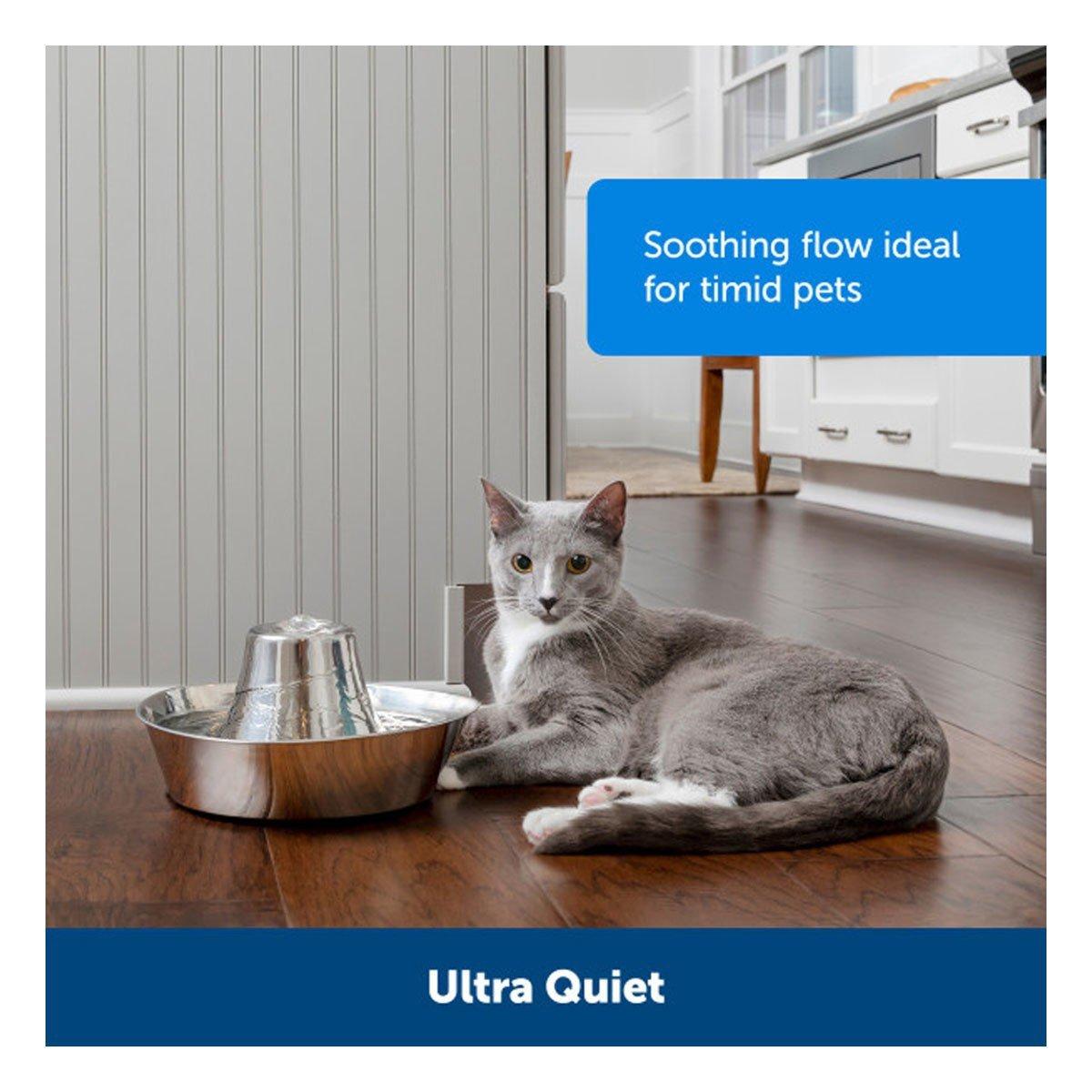 Help your cat stay happy, healthy and hydrated with the PetSafe Seaside Stainless Pet Fountain. Pet fountains continuously provide your pet with fresh, filtered water. Cats and dogs are attracted to flowing water which encourages them to drink more water and supports their overall health. This pet fountain holds 60 oz of water which is the perfect size for your cat or small dog. The quiet design of the fountain causes the water to softly bubble over the stainless tower (as opposed to a free-falling stream) which allows shy or timid cats to feel comfortable approaching the fountain. The fountain uses a pump, carbon filter and foam filter that work together to remove pet hair, saliva and bad tastes from the water, so they always have clean water to drink. The stainless-steel fountain is made from high-quality materials that are hygienic, scratch resistant and rust resistant. . When it is time to clean the fountain, place the stainless tower and bowl in the top shelf of your dishwasher and clean the pump by hand. PetSafe brand is here to help you and your pet live happy together™.