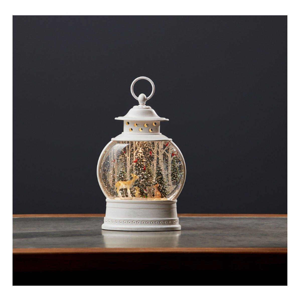 Illuminate your home this Christmas season with the stunning Lighted Lantern Snow Globe with Woodland accents. This piece features a snowy forest and woodland animals inside of a lantern-shaped snow globe. The traditional lantern design paired with the sparkley globe contents makes this set a great addition to any style of holiday decor. The piece includes a 6-hour timer function. Requires 3 AA Batteries (not included).