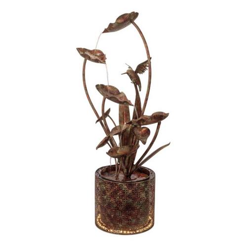 Add a touch of nature’s beauty to your space with the Cascading Iron Hummingbird and Leaf Fountain. Featuring earthy brown tones with a copper and bronze iron finish, this fountain showcases a delicate hummingbird and leaf sculpture design. Water flows from tiered leaves, cascading into the round basin below, creating the soothing sound of trickling water. The light at the base, surrounded by an ornate geometric metal frame, adds a calming glow to your garden, patio, or indoor space. This fountain includes a water pump and light kit, powered by an 83" UL cord for versatile placement.
