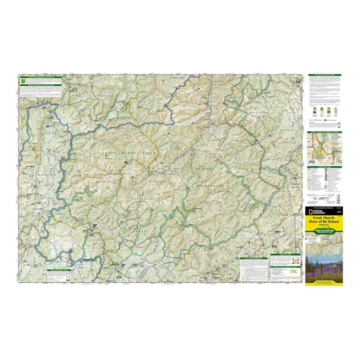 National Geographic's Trails Illustrated map of the Frank Church-River of No Return Wilderness maps the largest contiguous wilderness in the Lower 48 in its entirety. The area is filled with steep, rugged mountains, deep canyons, and wild, whitewater rivers. The Salmon River Canyon runs through the northern edge of the wilderness and is one of the deepest gorges in North America, deeper even than the Grand Canyon. "The River of No Return" name comes from the early days when boats could navigate down the river, but could not get back up through the fast water and numerous rapids.