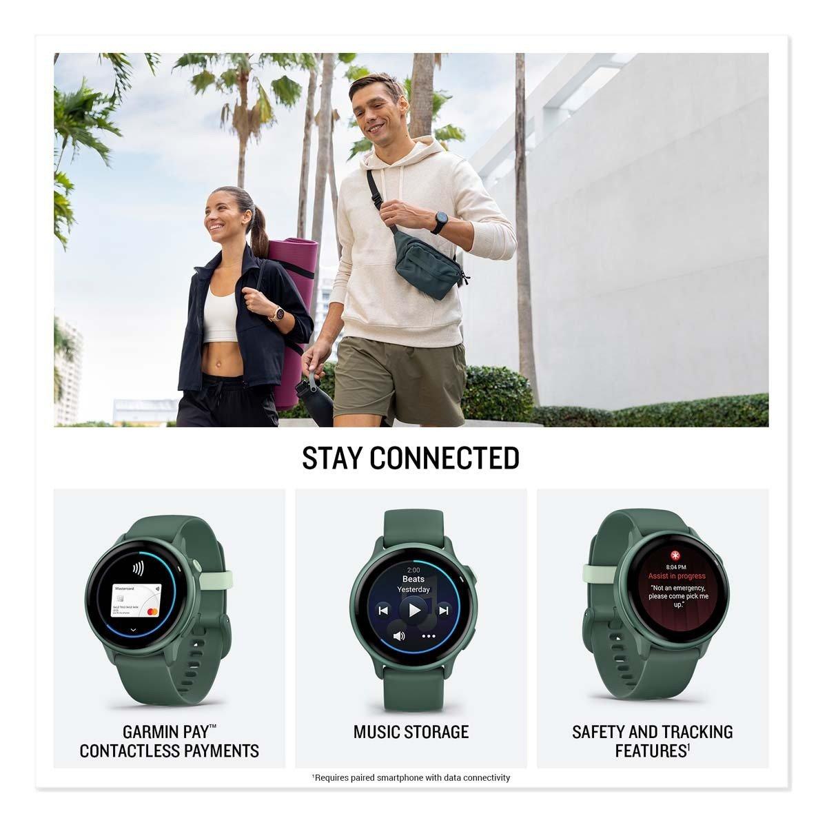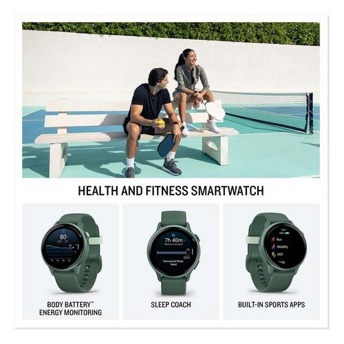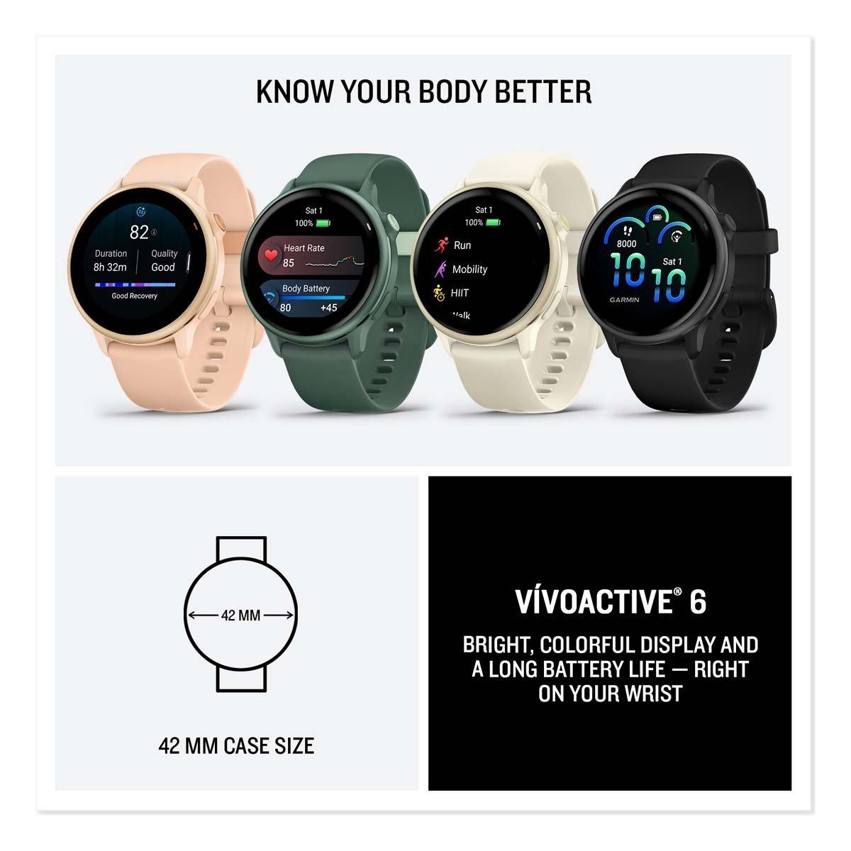 Understand your body better with vívoactive® 6, the health and wellness smartwatch. Featuring a bright AMOLED display and up to 11 days of battery life, this GPS smartwatch is purpose-built with essential health and fitness features. Body Battery™ energy monitoring helps you keep your energy levels in check with personalized insights based on sleep, naps, stress, workouts and more. Improve the quality of your sleep with personalized sleep coaching and nap detection plus even more details such as HRV status (data presented is intended to be a close estimation of metrics tracked). During the day, keep your activities fresh with more than 80 built-in sports apps — plus fitness features such as daily suggested workouts for walking to help you reach your goals. When paired to your smartphone, vívoactive 6 makes it easy to receive texts, emails and other smart notifications right from your wrist. Plus, enjoy connectivity features such as music storage, Garmin Pay™ contactless payments (with a supported country and payment network) and more.