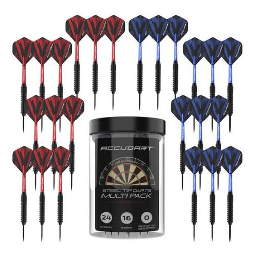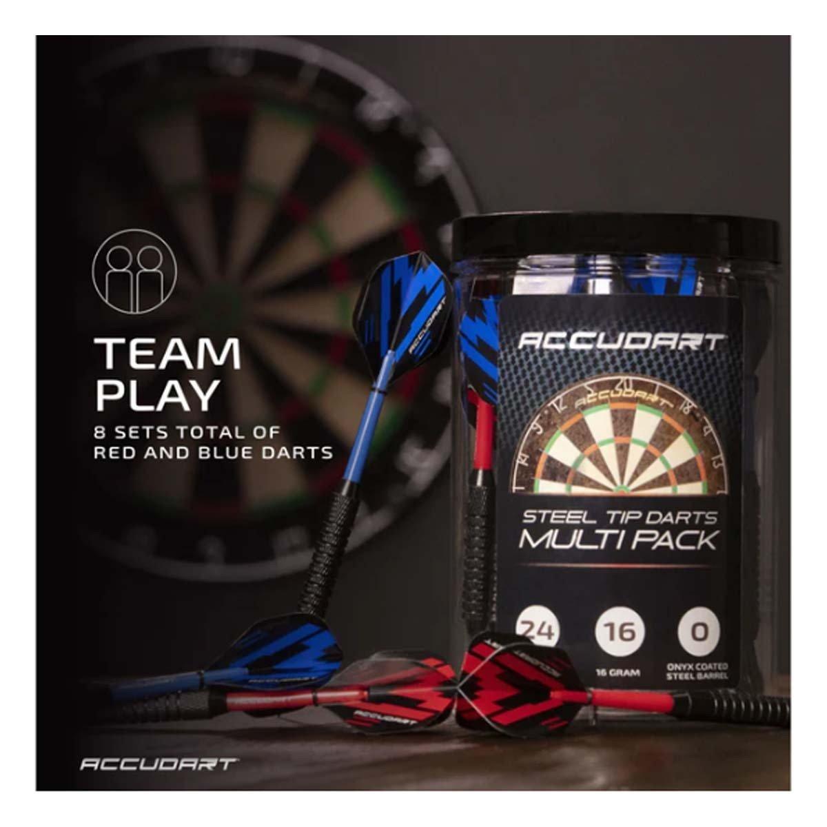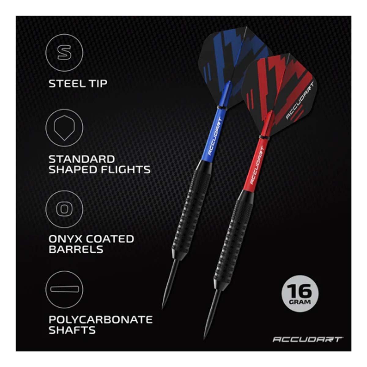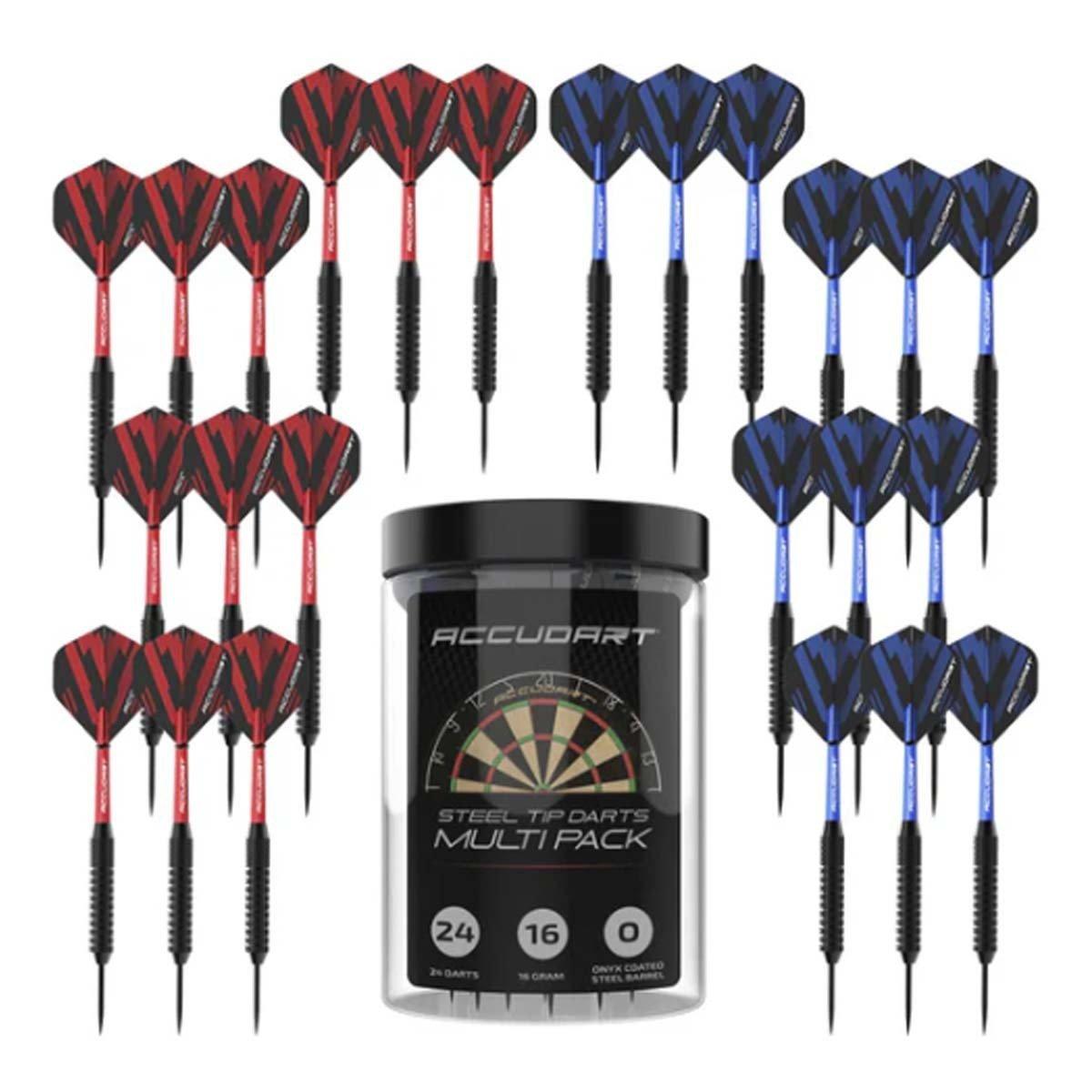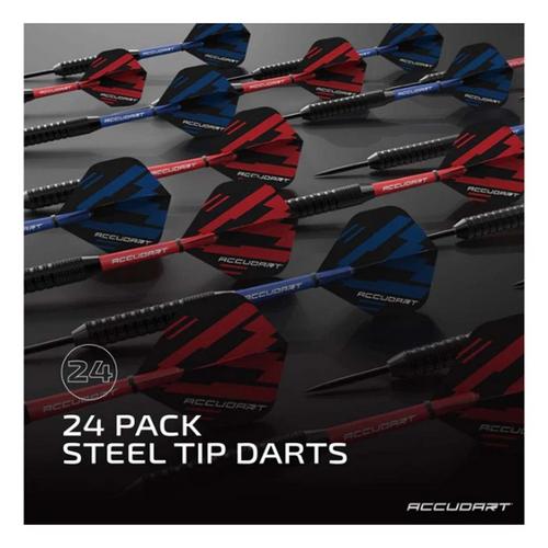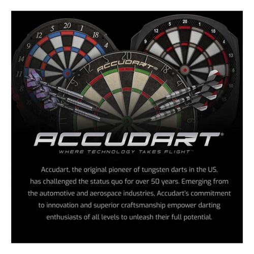 Elevate your dart game with the Accudart 24 Dart Multi-Pack, perfect for team play in the game room or at the pub. Featuring sleek onyx coated steel barrels weighing 16 grams each, this dart set ensures precision and durability, ideal for competitive play on bristle dartboards. The included polycarbonate shafts boast durability with spring clips that securely tighten down flights, guaranteeing optimal performance. Paired with standard poly flights, this set provides balanced flight, drag, and speed, allowing players to achieve their best throws. Accudart, the original pioneer of tungsten darts in the US, brings over 50 years of expertise to the table, emerging from esteemed industries like automotive and aerospace. Their commitment to innovation and superior craftsmanship empowers darting enthusiasts of all levels to unleash their full potential on the board.