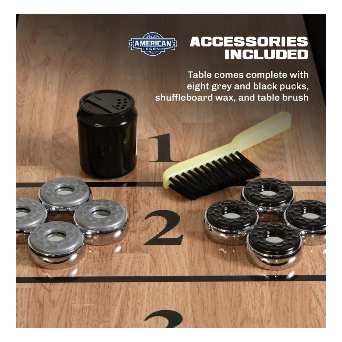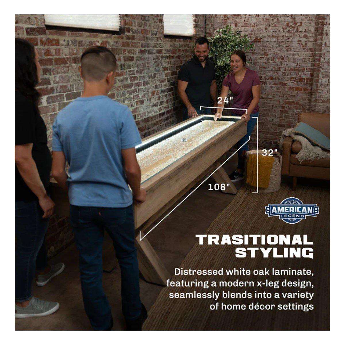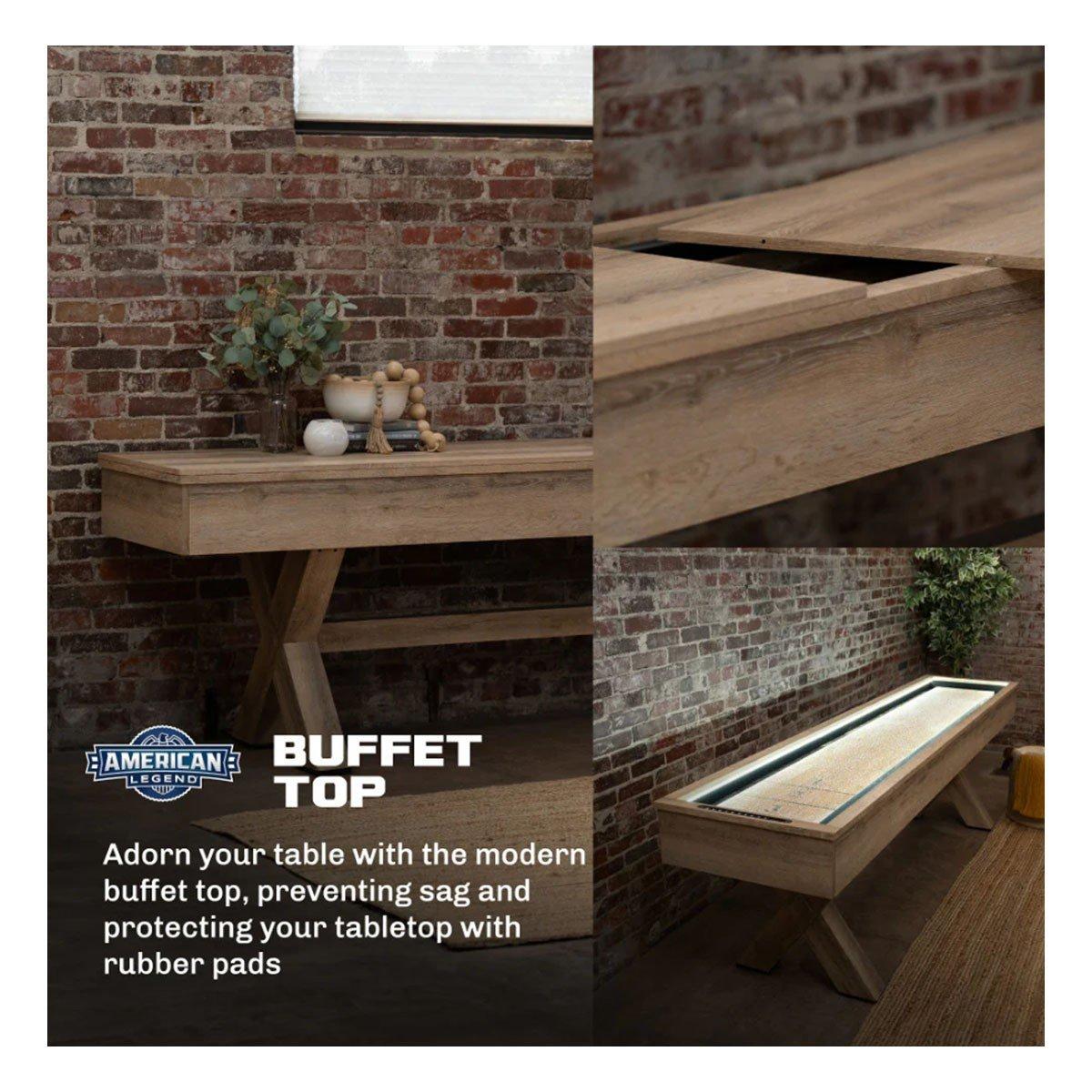 The American Legend LED Shuffleboard Table with Buffet Top comes as a versatile and stylish addition to any game room, basement, or living room. The distressed white oak laminate and modern x-leg design effortlessly blend into various home décor settings, while the upgraded LED rails provide a unique twist and enhance the visibility of the play surface. Keeping track of the game score is a breeze with the integrated scoring system located on each end of the table. The modern buffet top adds both functionality and style, featuring a secure 2-piece leaf design that prevents sag and protects your tabletop, accompanied by rubber pads for added durability. With all accessories included, such as eight grey and black pucks, shuffleboard wax, and a table brush, the American Legend LED Shuffleboard with Buffet Top is ready to bring hours of fun and excitement to your space.