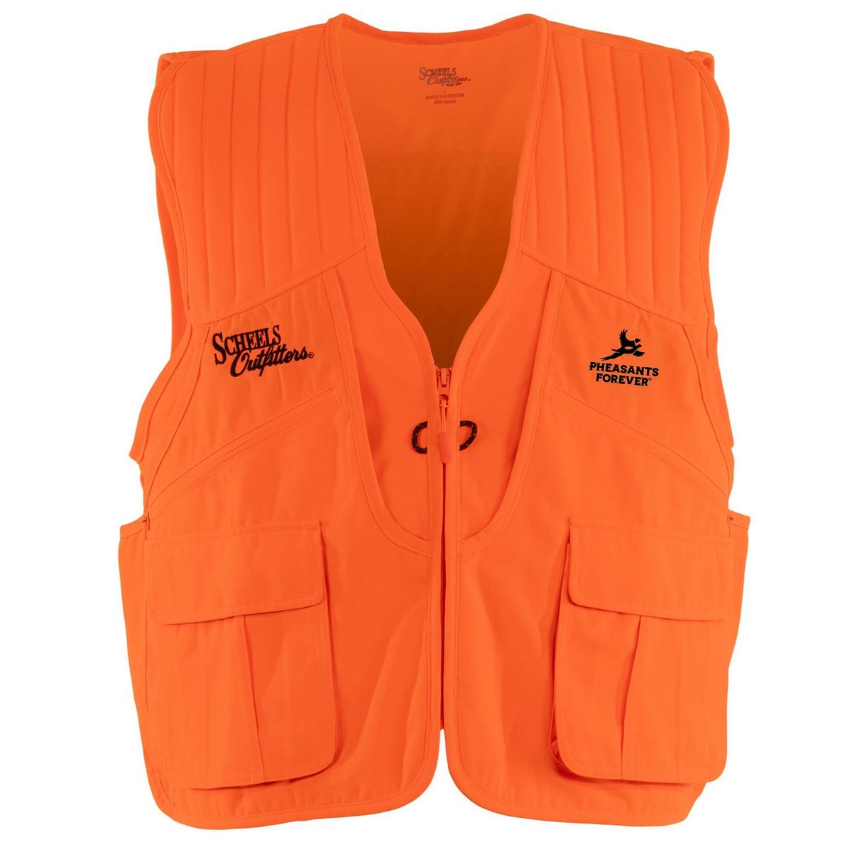 The Scheels Outfitters Pheasants Forever Upland Vest is a versatile hunting vest that will last for seasons of hunting. This blaze orange hunting vest features a front-loading game bag for carrying pheasants, grouse, quail, and other small game birds. Zippered front pockets offer convenient storage for gear like water bottles, gloves, and more. Plus, this Scheels Outfitters Pheasants Forever Upland Vest has padded shooting shoulders to reduce fatigue and keep you comfortable shot after shot.