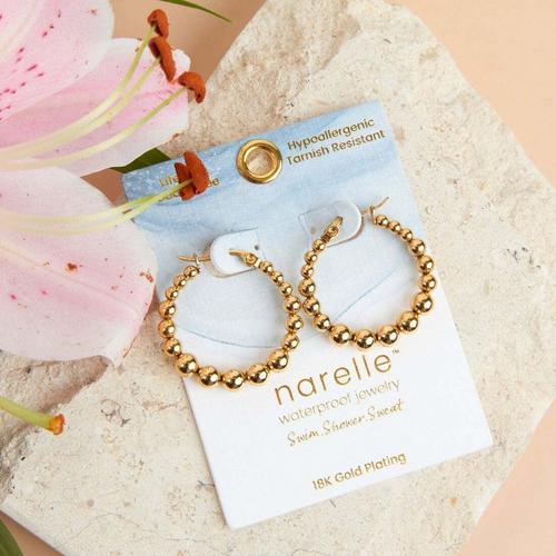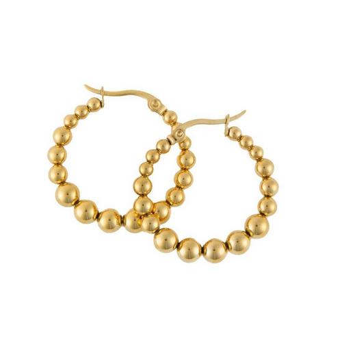 Chic and understated, the Narelle Waterproof Bubble Hoop Earrings offer a trendy bubble hoop design in the classic, goes-with-everything gold. With a familiar pin catch closure and effortless style, these earrings will easily become a wardrobe staple. Waterproof , 18K gold plated and made with a specialized PVD technique to withstand the rigors