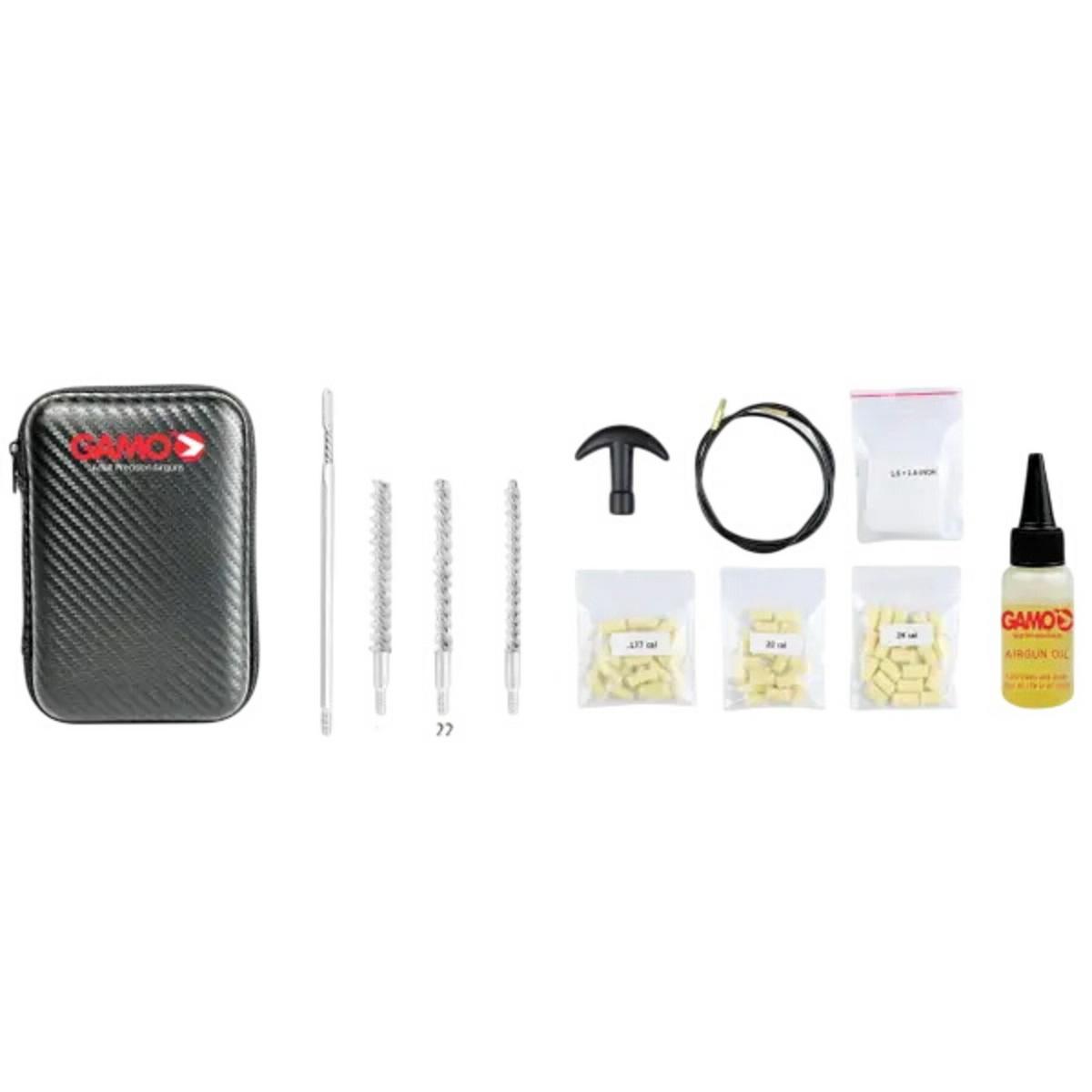Keep your air rifle in peak condition with the Gamo Air Rifle Cleaning Kit, a comprehensive solution designed for meticulous maintenance. This all-in-one kit supports .177, .22, and .25 caliber rifles, ensuring you have the right tools for all your popular airgun models. It includes a valuable bottle of Gamo Gun Cleaning Oil (.95oz) to lubricate and protect, along with a flexible 30-inch Flex Cable and T-Handle for easy navigation through your barrel. You'll find nylon barrel brushes specifically sized for each caliber, 20 wool cleaning pellets for each caliber, and 50 versatile 1.5"x1.5" cleaning pads to effectively remove residue. A cleaning jag is also included to secure your pads and pellets. Everything stores neatly in the durable Gamo Zipper Pouch, featuring dedicated tool cavities and a mesh pocket to keep your essential cleaning supplies organized and ready for your next session. Maintain optimal accuracy and extend the life of your air rifle with this essential cleaning kit.