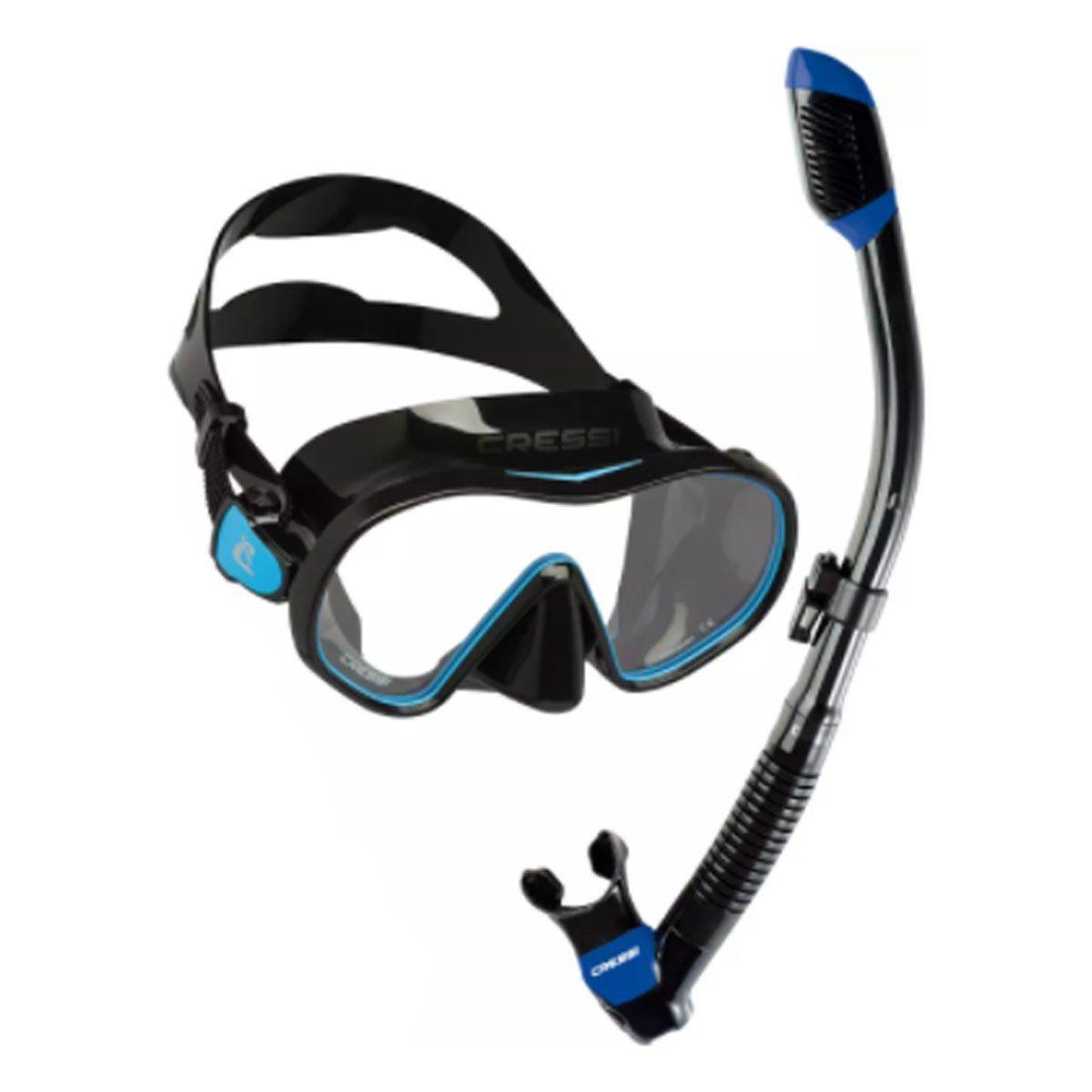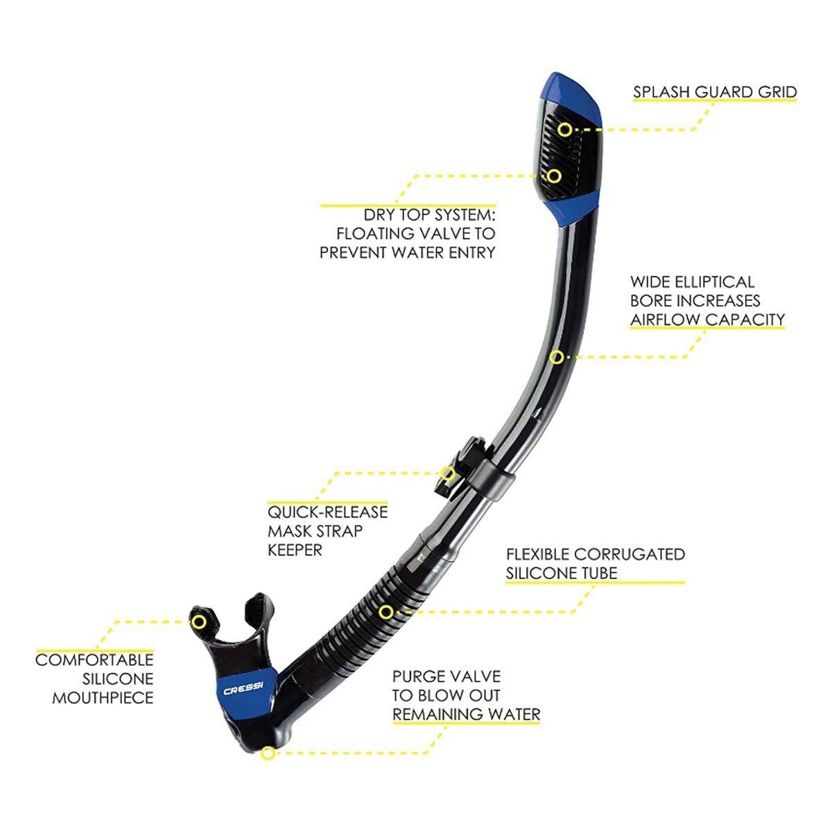 The F-Dual is a single-lens mask with a unique assembly of lens and skirt without a frame. The mask design bonds a high-grade silicone double-feathered edge skirt directly to a single tempered glass lens. The silicone facial is assembled directly on the glass with no need for a frame. This system ensures good visibility in all directions. The low internal volume allows for easy clearing and the quick-adjust strap buckles are molded directly into the skirt for a flexible fit and less drag. The F-Dual mask has a wide split strap design for comfort and to give even-tension on the skirt for a proper seal. The Supernova Dry has a unique Splash Guard at the top that reduces the entrance of water during use on the surface. The special valve on top seals the tube as you dive, almost totally blocking the entrance of water when the snorkel is submerged. A special water collection well, with a large elliptic valve, allows quick and easy expulsion of water.