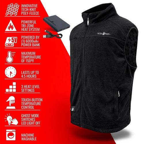 Stay warm and comfortable in any outdoor activity with the Men's ActionHeat 5V Battery Heated Performance Fleece Vest. The powerful Tri-Zone heating system includes three built-in heating panels, strategically placed on the chest and upper back to warm your core body temperature. With the Ghost Mode Patented Technology, you can turn your LED light off while keeping your heat on, making this great for hunters. The Touch-Button control technology offers three settings to keep you warm in all weather conditions, while the four LED lights on the battery pack indicate the power bank's battery life. Make the most of your time outdoors in the cold with the Men's ActionHeat 5V Battery Heated Performance Fleece Vest.