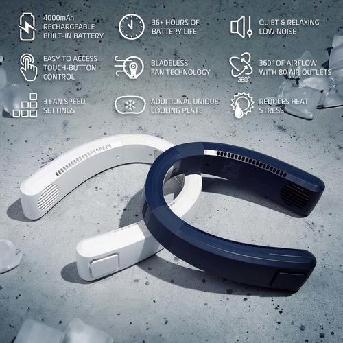 AlphaCool Portable Neck Air Conditioner offers immediate heat relief featuring a semiconductor cooling panel located on the back of the neck, and 360 degrees of airflow around your neck and head with 80 air outlets. Made out of ABS and silicone, and featuring a 4,000 mAh battery with 2 hour charging time, this neck cooler can keep you cool for up to 36 hours!