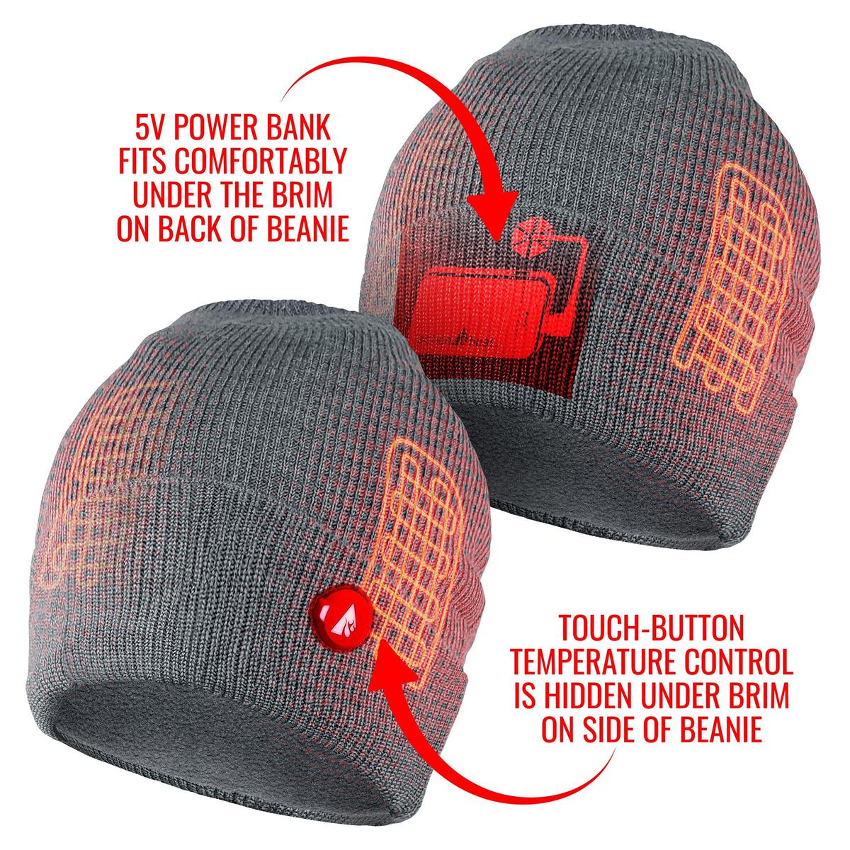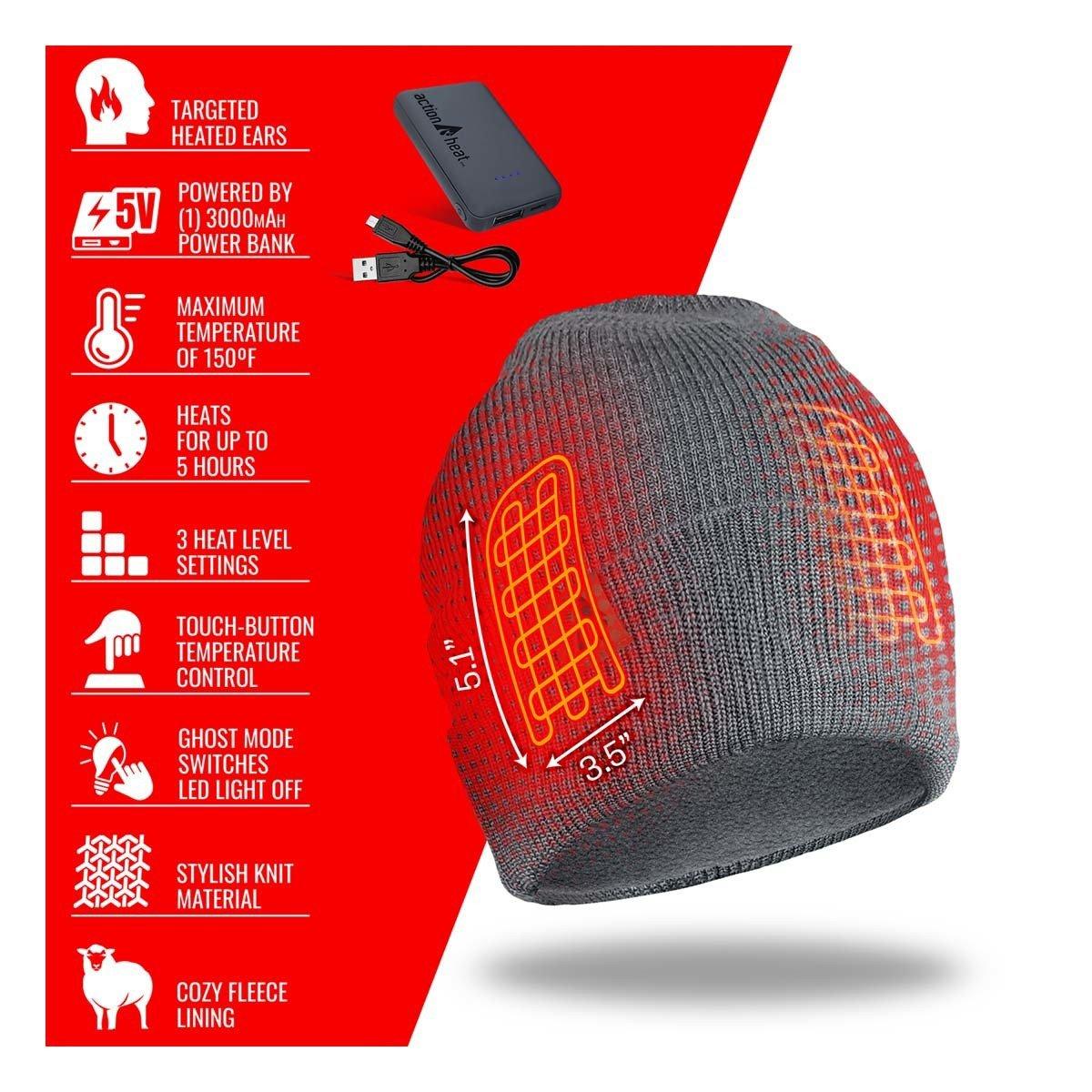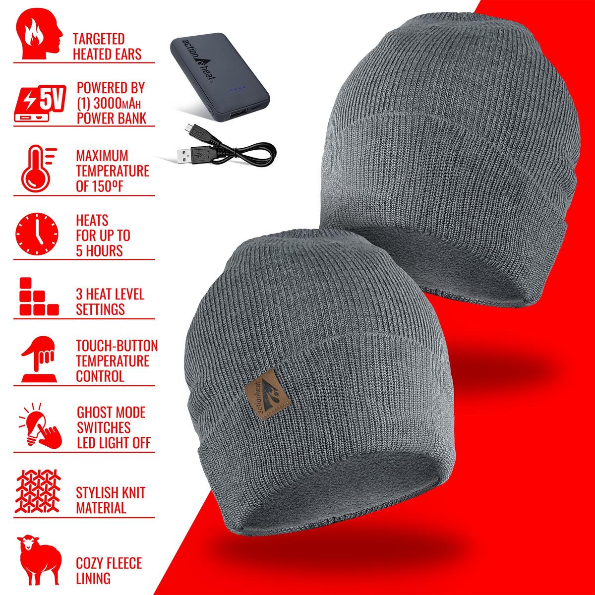 The ActionHeat 5V Battery Heated Knit Hat is designed to keep your head warm when during winter activities with two heating zones positioned over each ear. Featuring a stylish design, the hat traps your head's natural heat, you will love the extra comfort of strategically placed heating panels on both ears. Once the knit hat is powered on, the heating elements quickly heat up and keep your whole head toasty. The rechargeable 5V lithium-polymer batteries deliver 3 levels of heat, controlled by the temperature controller on the hat. The hat can reach a maximum temperature of 130F while lasting up to 4.5 hours.