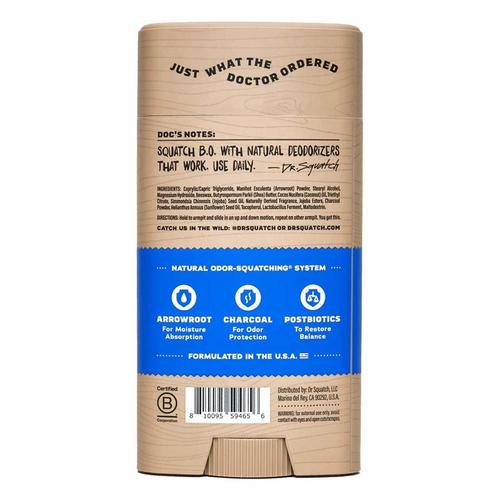 Dr. Squatch natural men’s deodorant keeps you fresh so that you can go about your day with confidence, no matter where it takes you. Our Odor-SquatchingTM system fights potential sources of B.O from every angle with powerful natural deodorizers such as Charcoal Powder to block odor, Postbiotics for microbiome support, and Arrowroot Powder to absorb moisture. With a smooth glide application and skin-nourishing moisturizers like Jojoba and Shea Butter, our deodorant is gentle on your skin and leaves you—and your pits—ready for any adventure.