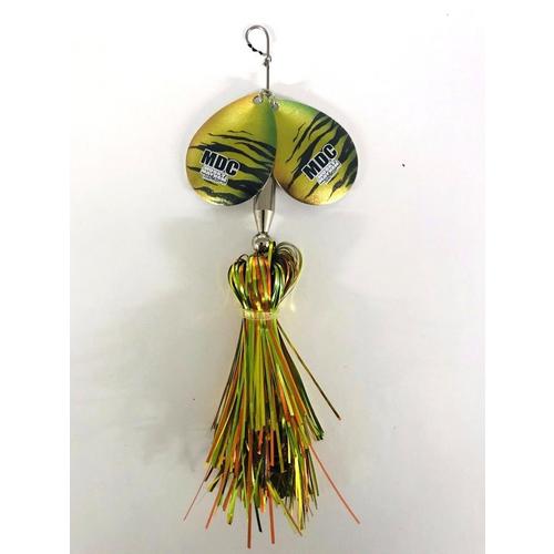 The MDC is the smallest of the Musky Mayhem Tackle LLC collection designed to catch bass, pike or muskies. Sticking with the double blade design is also creates a tremendous vibration in the water giving the flashabou skirting lifelike action just like the bigger versions. It is only 3/4 oz making it great for casting.