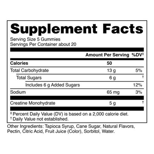 Bucked Up Creatine Gummies are here to change the game. Packed with 5,000mg of pure, high-quality creatine monohydrate, these gummies fuel muscle growth, performance, and strength with every chew.* And we're not talking about flavorless chalk?you?ll find Tropic Thunder, Raspberry Blitz, Melon Madness, Knockout Punch, and Blue Blast flavors that make getting strong taste better than ever.Take a look in the mirror and see the face of someone who?s making progress.* It?s time to ditch the old supplements, toss the shaker, and pick up something that delivers real results. Chew, enjoy, perform, repeat. We didn?t cut corners, and neither should you. Grab your gummies and start seeing what consistent effort actually looks like.Because at Bucked Up, we want to see you working out. We want to see you push your boundaries, every single day.