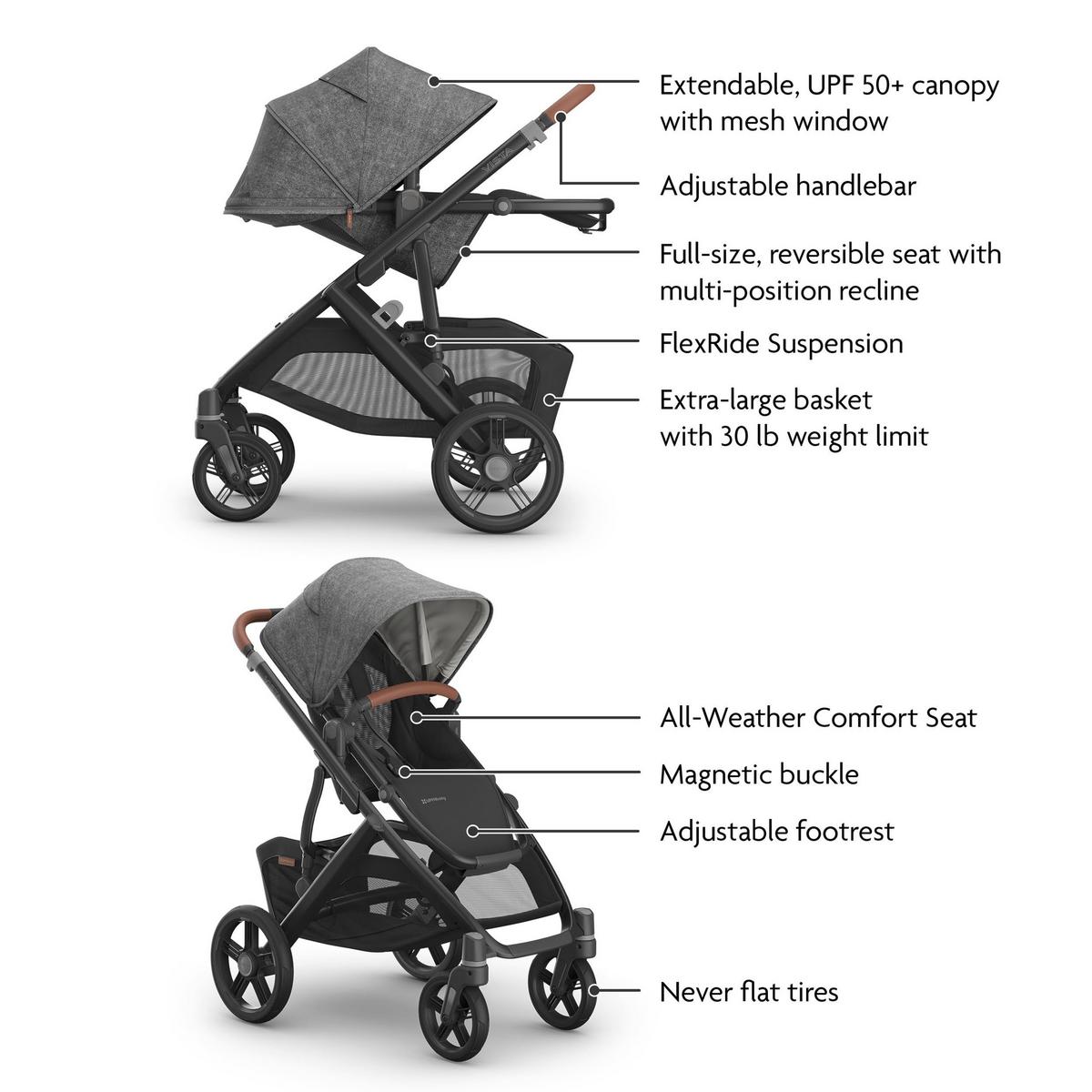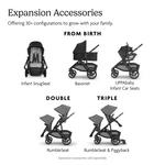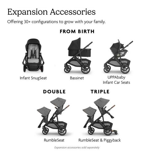 Our Vista stroller is intuitively designed to “grow” with your family! It starts as a single stroller but can easily transform to accommodate up to three children with added accessories and adapters — becoming the ultimate in portability and convenience!