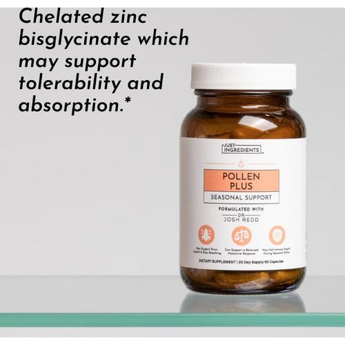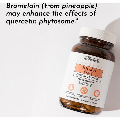 When the seasons shift, reach for Pollen Plus to help support your body’s defenses.* We included bioavailable zinc bisglycinate to support a normal inflammatory response, quercetin phytosome to help protect cells from oxidative stress, and bromelain, which may help support quercetin absorption.* We’ve also added astragalus, nettle, ginger, rutin, and pine bark for more antioxidant support and additional wellness benefits.*