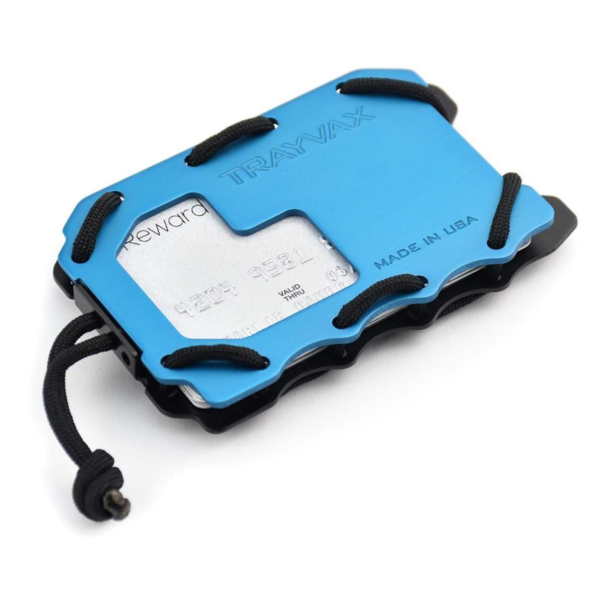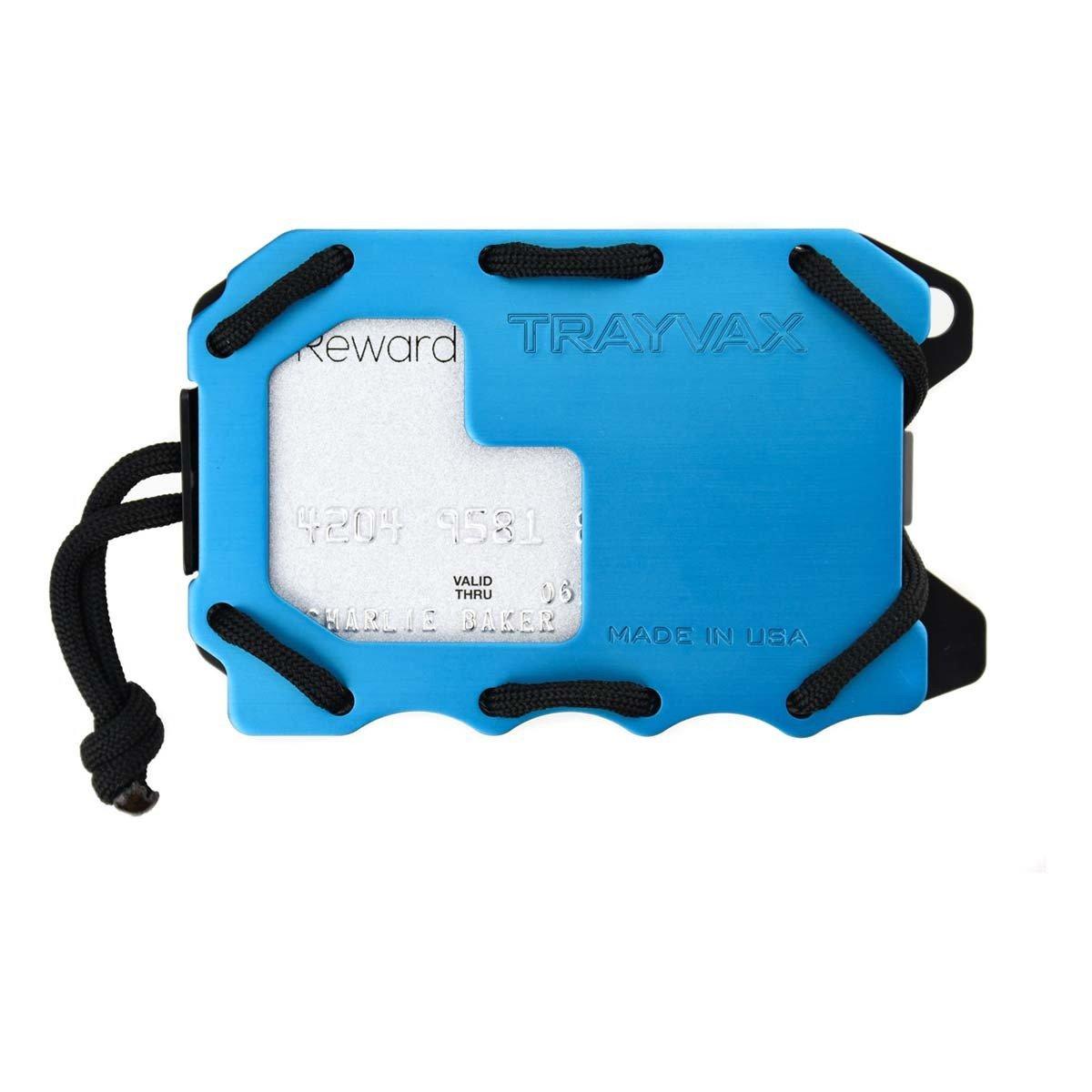Keep your money, credit cards, and ID easily accessible and protected from RFID chip readers with this cool and stylish Trayvax Original 2.0 metal card case wallet. This sleekly modern skinny wallet features an ID badge holder, easy to access ID window, and can hold up to 15 cards and features an integrated money clip which can hold up to 5 bills. This mens and womens minimal wallet is constructed with an anodized aircraft grade aluminum front plate and a slim stainless steel back plate which provides protection from RFID chip readers. The minimalistic metal cardholder wallet is small enough to be easily kept in a front pocket while you travel, and also features a built-in bottle opener, attachment point, durable pry bar, security clasp, and is secured with MIL-SPEC paracord. This RFID protective wallet is proudly made in the USA and is backed by Trayvax's 65 year warranty.