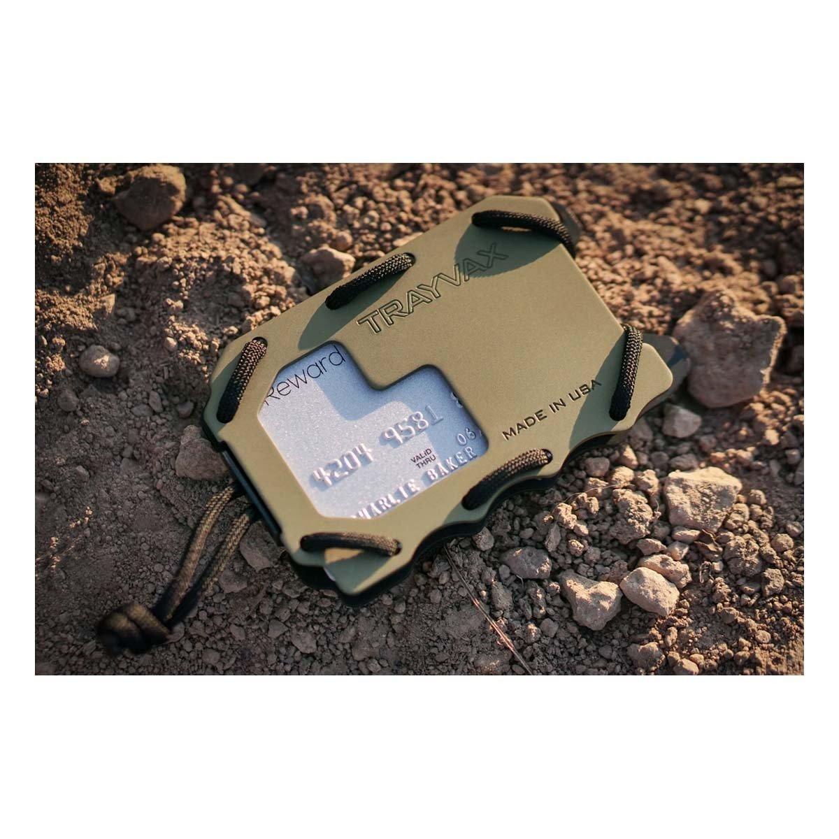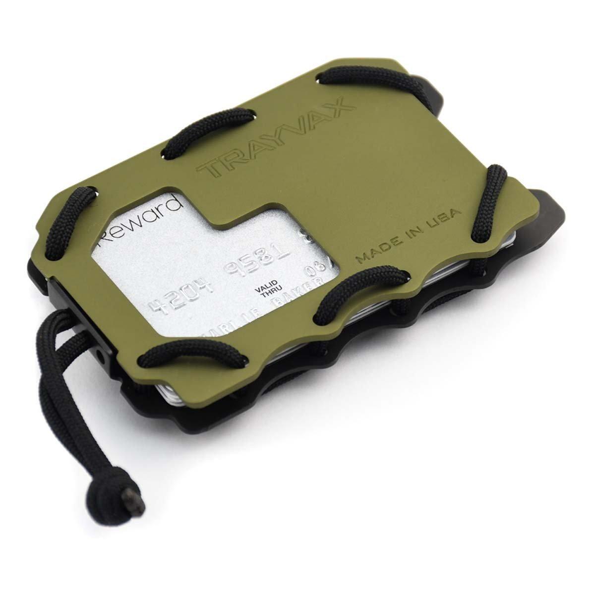 Keep your money, credit cards, and ID easily accessible and protected from RFID chip readers with this cool and stylish Trayvax Original 2.0 metal card case wallet. This sleekly modern skinny wallet features an ID badge holder, easy to access ID window, and can hold up to 15 cards and features an integrated money clip which can hold up to 5 bills. This mens and womens minimal wallet is constructed with an anodized aircraft grade aluminum front plate and a slim stainless steel back plate which provides protection from RFID chip readers. The minimalistic metal cardholder wallet is small enough to be easily kept in a front pocket while you travel, and also features a built-in bottle opener, attachment point, durable pry bar, security clasp, and is secured with MIL-SPEC paracord. This RFID protective wallet is proudly made in the USA and is backed by Trayvax's 65 year warranty.