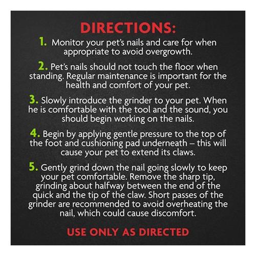 The FURminator® Nail Grinder files and smooths nails with ease on both dogs and cats. Pets need their nails trimmed on a regular basis. Untrimmed nails can affect their comfort and health and cause them to develop sore feet, legs and hips. This two-speed cordless grinder is lightweight, compact and easy to handle. Each grinder comes with two grinding bands, four AA-alkaline batteries and a built-in LED light that illuminates the nail for easier and safer trimming. Make nail care part of your in-home grooming routine. For best results, use with other FURminator® grooming products as part of a complete regimen.