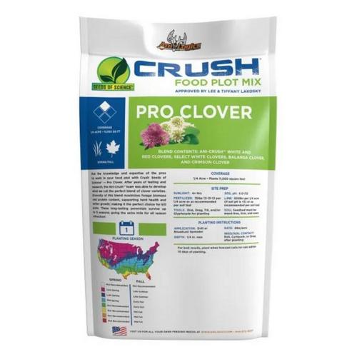 If you want a fast-growing, highly attractive food plot that will bring in deer and turkeys all spring and fall, CRUSH® Pro Clover is the answer. Our blend of lush annuals and perennials takes a licking and keeps on ticking when faced with heavy browse pressure. These varieties have the perfect mixture of attraction and longevity. If you properly maintain the plot to keep out weed species, you can expect at least 3-5 years out of a single planting of Pro Clover. This blend has 6 different clovers that were hand-picked by Lee Lakosky to be the most effective clover blend you can buy.