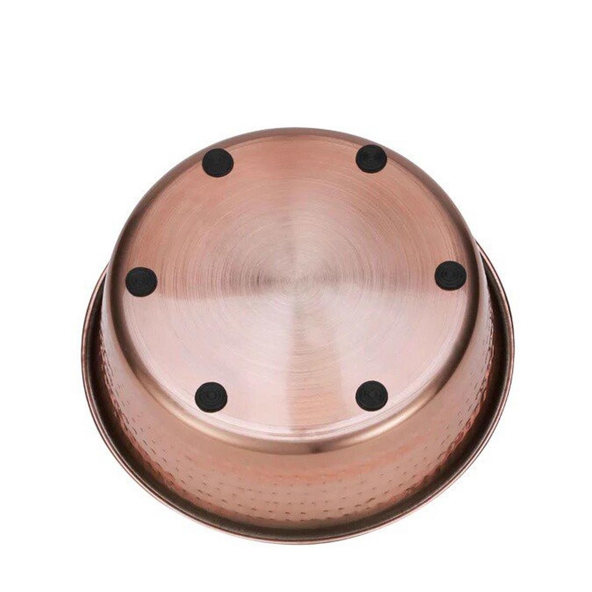 Stainless steel bowl with a beautiful copper finish and hammered design. Non-skid rubber on the bottom prevents movement on your floor and reduces noise.