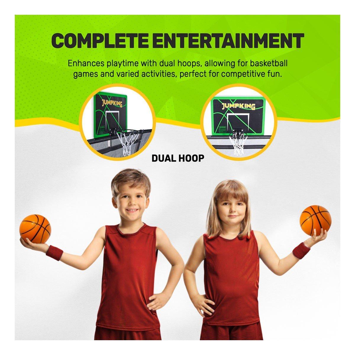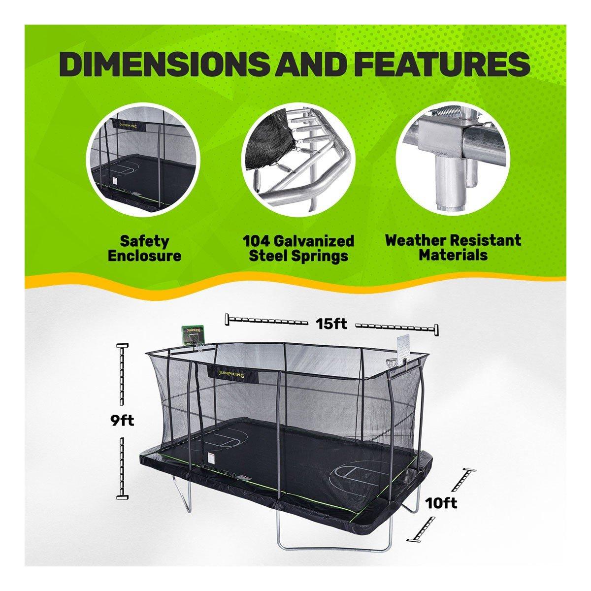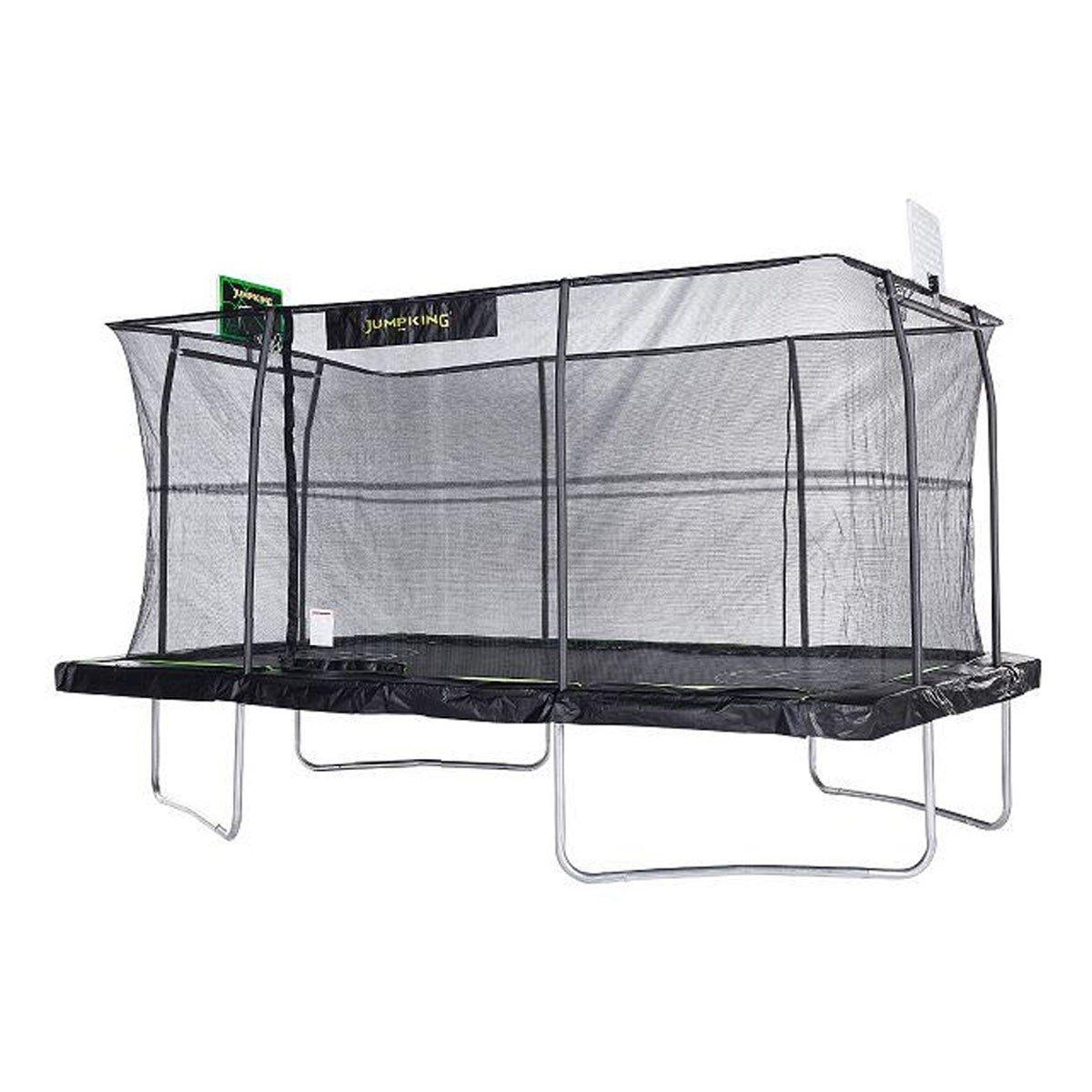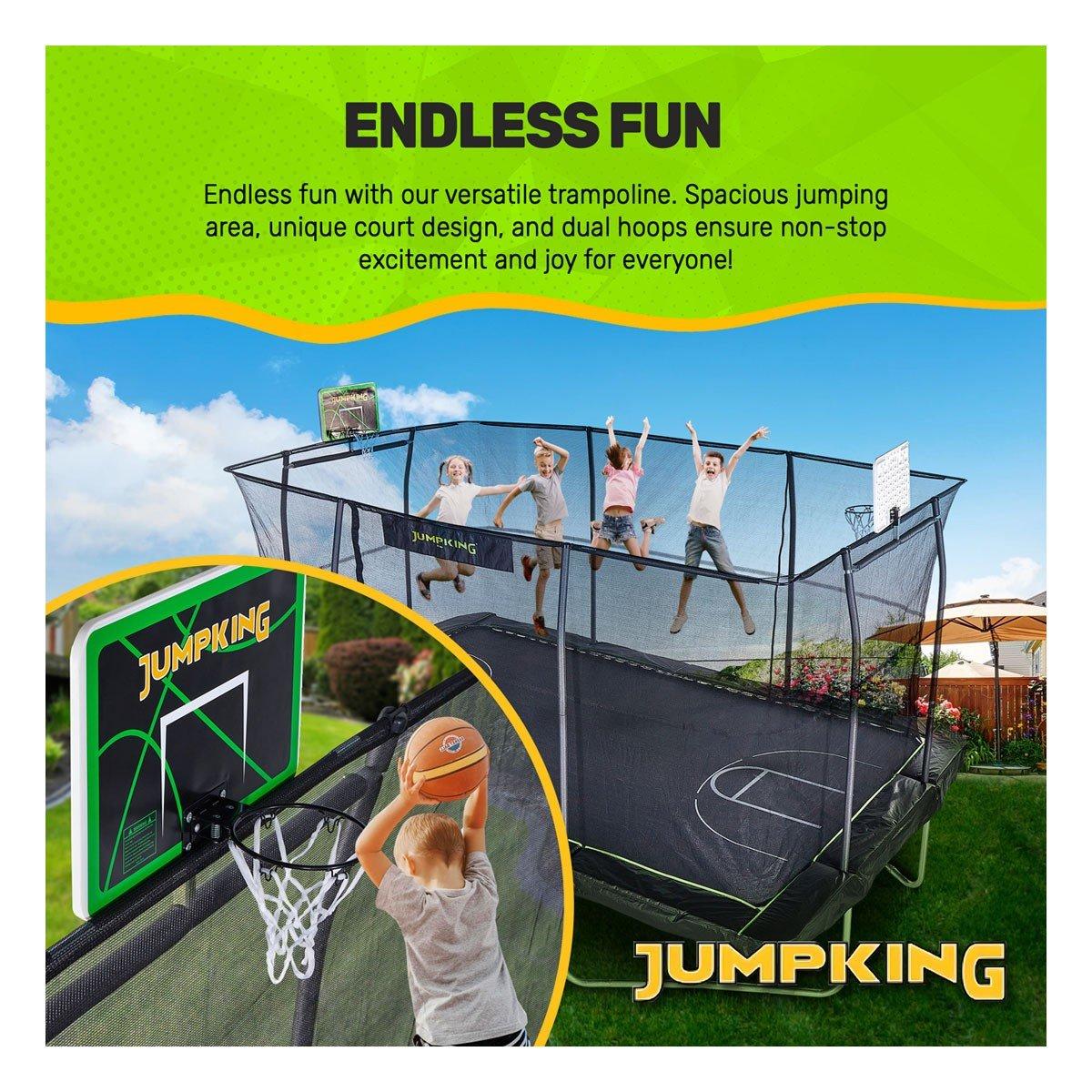 Experience ultimate bounce with our JumpKing Professional Rectangular Trampoline with enhanced basketball hoop & powder coated breakaway rim, featuring 104 weather-resistant galvanized steel springs for unparalleled bounce. With a maximum static weight capacity of 800 lbs, it's the perfect rectangle trampoline for kids and adults. Its innovative UV-protected polypropylene jumping surface, ensures superior airflow and durability. Safety is a priority with our heavy-duty safety pad, foam-padded mesh enclosure, and secure netting supported by 8 poles, all backed by a 1-year warranty. Enjoy hassle-free setup with user-friendly instructions and low-maintenance materials. Versatile for all ages, it’s ideal for outdoor backyard fun, fitness trampoline for routines, gymnastics trampolines, and more, transforming any space into an exciting recreational rectangle trampoline with basketball hoop for added excitement in the play area.