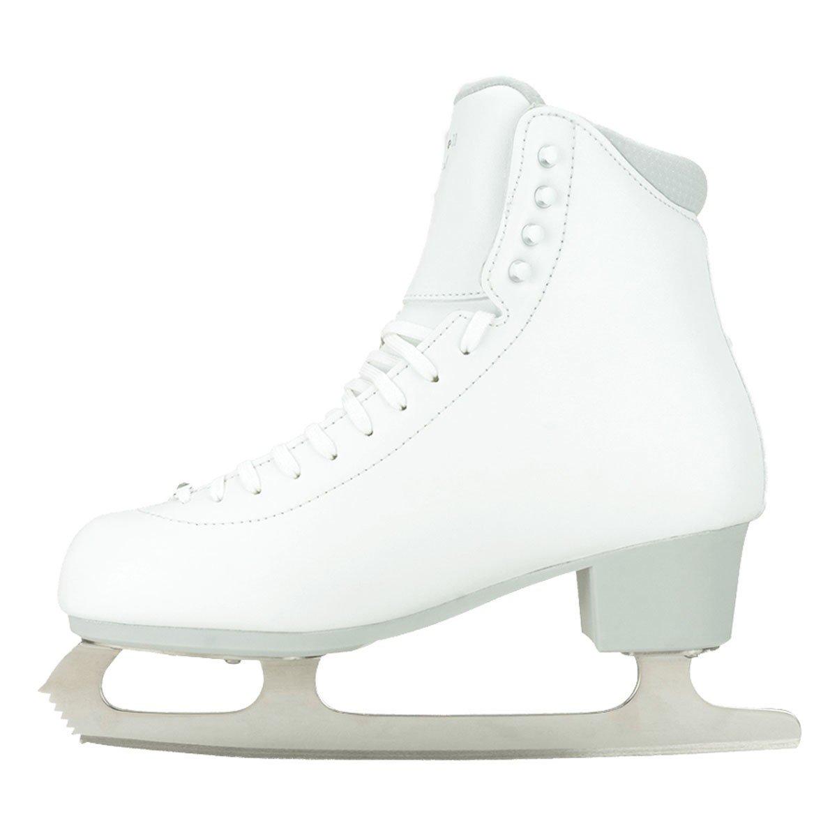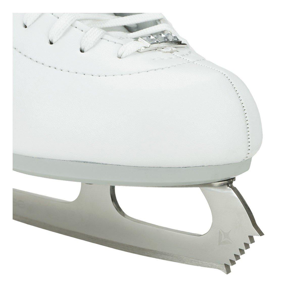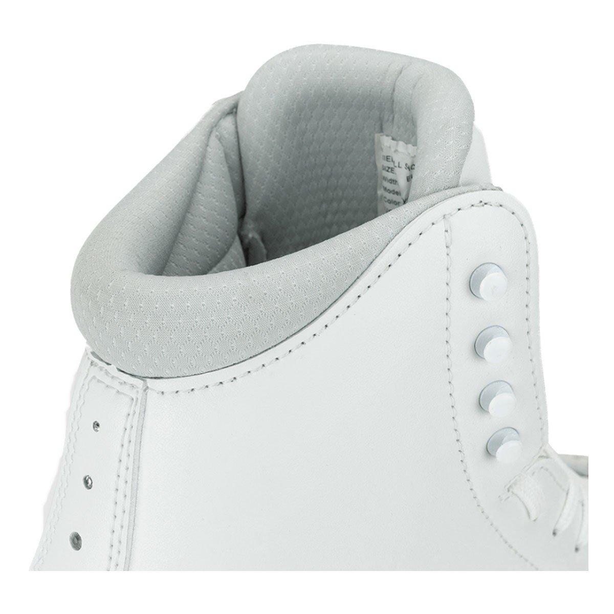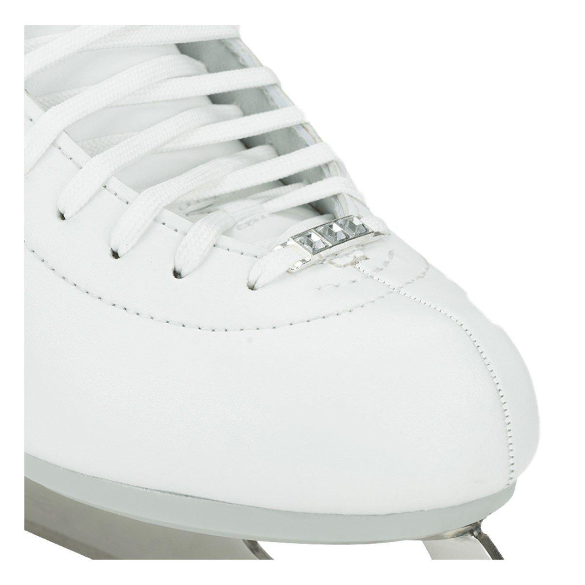 This skate set also offers a modern ergonomic toe fit for out-of-the-box comfort. The plush hand rolled collar provides relief to the Achilles tendon and a flex notch design facilitates proper knee and ankle bend. Beyond the technical features, each skate is adorned with faux crystals in the backstay and a decorative gem lace bar for added sparkle on the ice.
