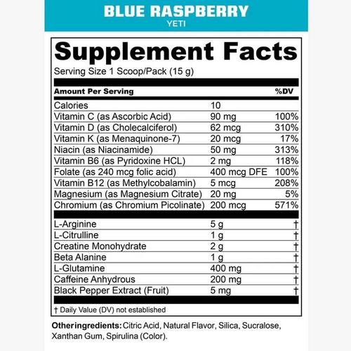YETI was formulated to deliver explosive training results and provide smooth, non-jittery performance for the athlete that trains year-round. Our powerful blend of Amino Acids L-Arginine and L-Citrulline, coupled with L-Glutamine, Creatine Monohydrate and Beta-Alanine, YETI helps provide energy and performance, helping you take your training from routine, to extreme.