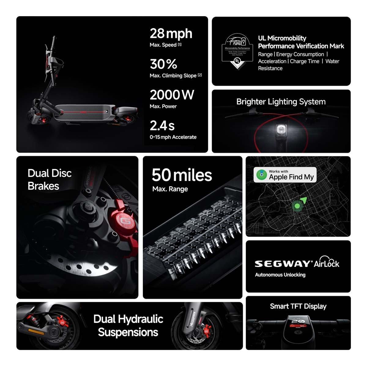 Coming from a legacy of excellence, the all-new Max G3 is the latest version of our flagship eKickScooter, designed for both adults and teens seeking premium performance. Packed with a powerful 2,000-watt max power motor, improved speeds of 28 mph, and a range of up to 50 miles with SegRange, it’s the perfect fast electric scooter for commuting, adventure rides, and everyday fun. Featuring the latest smart technologies like Airlock and a Smart TFT display, the Max G3 sets the standard for eKickScooters with MAXimum potential, thrill, and performance.