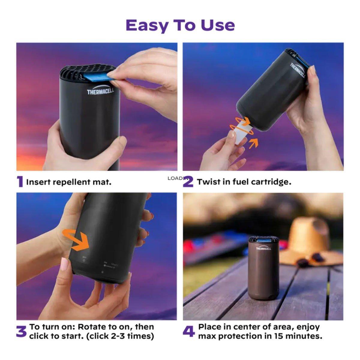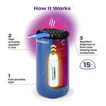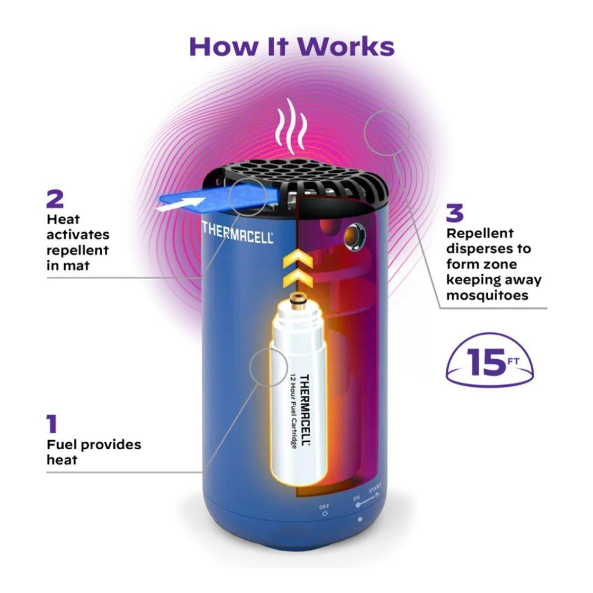 Mosquitoes ruin everything. Thermacell's award-winning technology keeps mosquitoes away by creating a 15FT protection zone around you. Our proprietary formula precisely targets mosquito sensors, driving them away. With consistent protection that doesn't weaken over time, Thermacell helps you live your best outside life without the use of bug sprays or lotions on your skin. Powered by a safe and compact 12-hour fuel cartridge. 12 hours of mosquito repellent included.