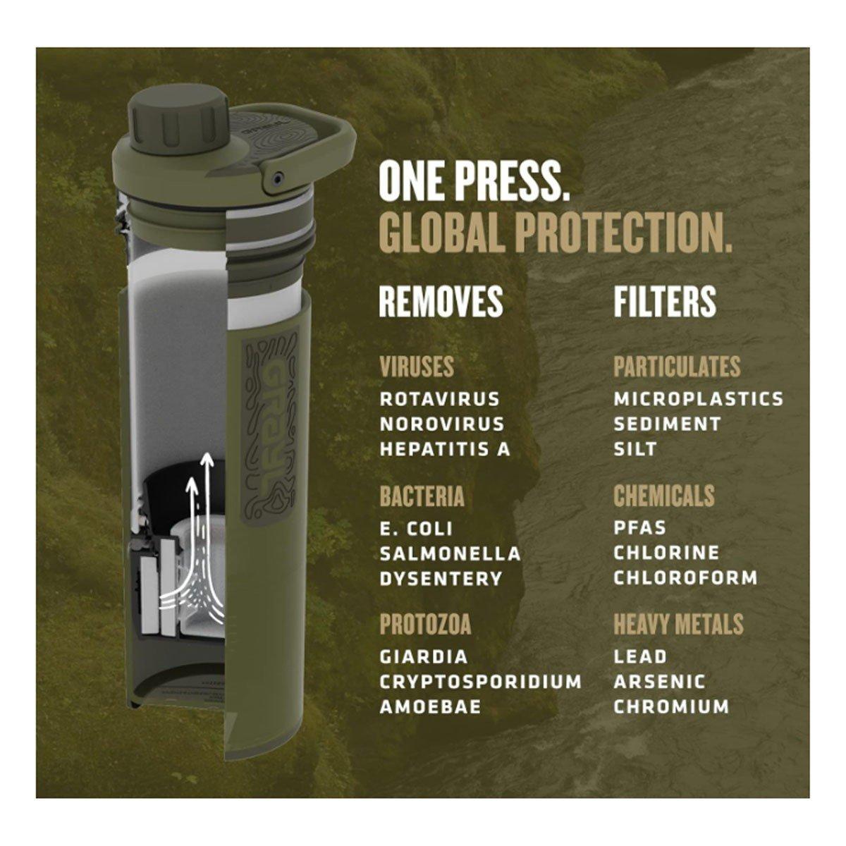 Compact, fun, and ridiculously easy to use — the 16.9oz UltraPress® Purifier Bottle fits into any pack pocket (or cup holder), requires zero setup, and makes clean, great tasting drinking water in a mere 10 seconds (3L/min). On-the-go filtration and purification for the hiker, backpacker, camper, emergency prepper or global traveler seeking fast-flow purified water for chugging, filling hydration reservoirs, or cooking.