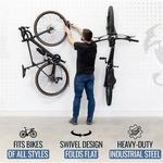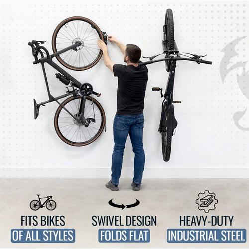 Get organized and hang your bike on the wall for compact, accessible storage. The Swivel Mount Bike Storage Rack is designed to hold your mountain, road, or kids bike on the wall with three storage positions. Hang your bike straight out from the wall or flat against the wall to clear up floor space in your garage. Durable, rubber-coated hook securely holds the bike wheel while protecting the wheel rim from scratches. Save space and have your bike ready for your next ride with this innovative wall storage rack!