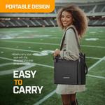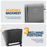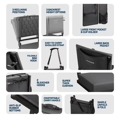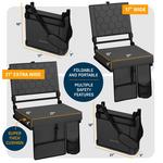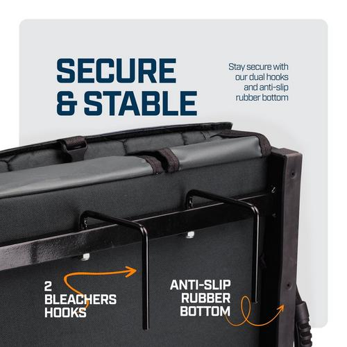 Wide folding stadium seat with padded cushion and supportive backrest, designed for comfortable seating on bleachers and other hard surfaces. Features 3 reclining positions, built-in storage, and secure bleacher hooks for stability and portability.