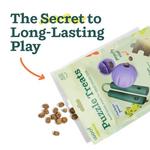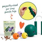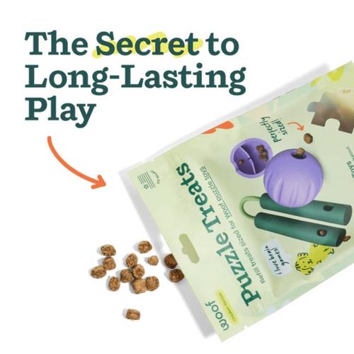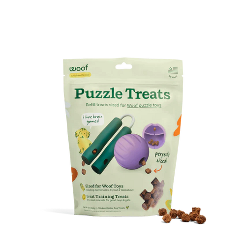 Meet the treat made for longer play. Perfectly sized for Woof puzzle toys, Puzzle Treats turn everyday fun into a tasty, brain-boosting challenge. Crafted with real chicken and brown rice, these protein-rich rewards are air-dried to lock in drool-worthy flavor (and irresistible aroma). Designed to fit Nomchucks, Walkabout, Flyball, and other puzzle or treat dispensing toys.