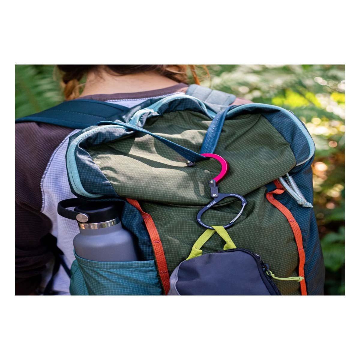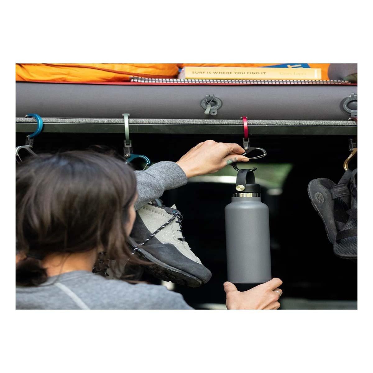 Heroclip Small gear clip lets you hook and hang water bottles at the campsite, and backpacks from shelves, counters, tables, chairs, or even doors. They’re also great for hanging gravity filters from tree branches, tools from ladders, or carry-on bags from roller suitcase handles. This versatile gear clip hangs securely, rotates 360°, and folds compactly in ways other carabiners, clips and hooks can’t, helping you keep your gear organized and exactly where you want it, no matter the activity. The clip also features a wider clip gate compared to standard carabiners and hooks, and a hook with a grippy rubber tip for hanging things from flat surfaces.