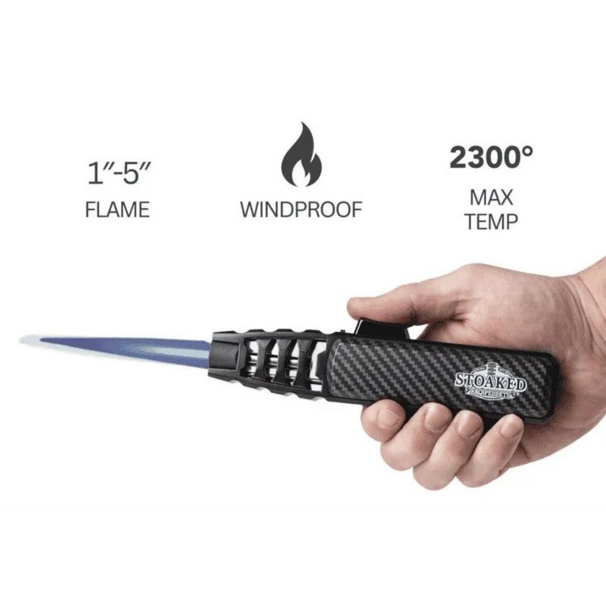 The Stoaked Jet Flame torch lighter is the next generation of lighter. The strong, windproof flame makes lighting charcoal, candles and firewood easier than ever. The refillable lighter has an adjustable 1-5 inch flame. Butane sold separately.