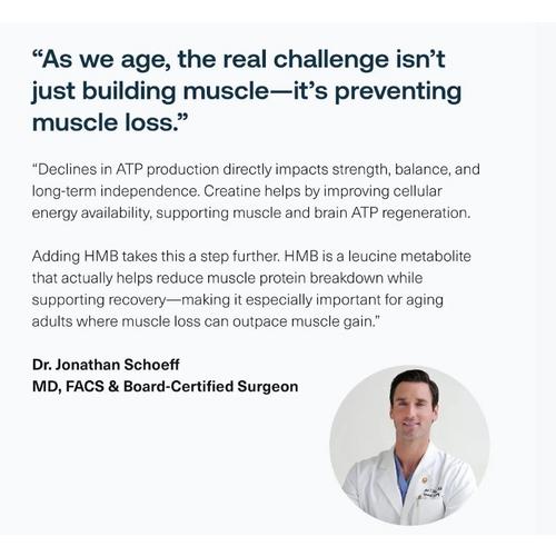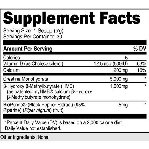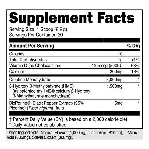 This formula harnesses the synergy of creatine monohydrate—the most studied form of creatine—and a naturally occurring metabolite known as beta-hydroxy-beta-methylbutyrate (HMB), the latter of which helps reduce muscle damage and muscle protein breakdown.