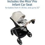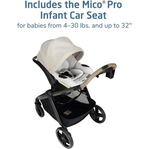 Included is the Mico™ Pro Infant Car Seat, a lightweight yet secure companion designed to cradle your newborn in plush comfort. Featuring removable, ultra-soft infant inserts and premium PureCosi™ fabrics, it ensures your little one is enveloped in cozy serenity. The Mico Pro accommodates infants from 4–30 lbs. and up to 32".