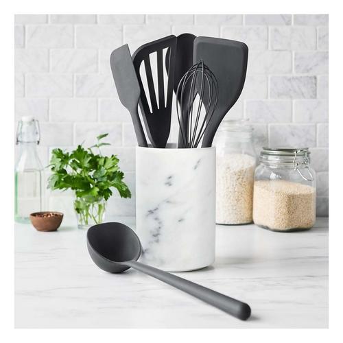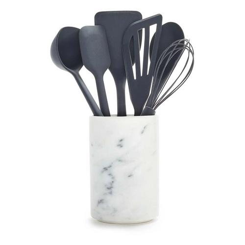 {"reviews":[],"offset":0,"limit":10,"total":0,"gtin":"885837048131"}"Full Description:\nOur silicone tools are optimized for control and performance, plus the striking ceramic crock adds a pop of color to any countertop while keeping your tools at the ready.\n\nFeatures:\n\u003cul>\n\u003cli>Flexible, stain-free, nonstick silicone construction\u003c/li>\n\u003cli>Rigid steel core for added durability\u003c/li>\n\u003cli>Anti-slip construction makes it easy to cook with confidence\u003c/li>\n\u003cli>Ceramic crock with marble pattern for easy storage\u003c/li>\n\u003cli>Heat-resistant silicone stays cool, safe up to 392˚F\u003c/li>\n\u003cli>Dishwasher safe\u003c/li>\n\u003c/ul>\n\nSpecifications:\n\u003cul>\n\u003cli>Fish Turner\u003c/li>\n\u003cli>13" Long\u003c/li>\n\u003cli>3.1" Wide\u003c/li>\n\u003cli>Spatula\u003c/li>\n\u003cli>12.2" Long\u003c/li>\n\u003cli>2.3" Wide\u003c/li>\n\u003cli>Solid Spoon\u003c/li>\n\u003cli>12.8" Long\u003c/li>\n\u003cli>2.9" Wide\u003c/li>\n\u003cli>Whisk\u003c/li>\n\u003cli>10.7" Long\u003c/li>\n\u003cli>2.6" Wide\u003c/li>\n\u003cli>Solid Turner\u003c/li>\n\u003cli>2.8" Wide\u003c/li>\n\u003cli>Ladle\u003c/li>\n\u003cli>3.4" Wide\u003c/li>\n\u003cli>Ceramic Crock\u003c/li>\n\u003cli>4.7" Diameter\u003c/li>\n\u003cli>7.2" High\u003c/li>\n\u003c/ul>\n"
