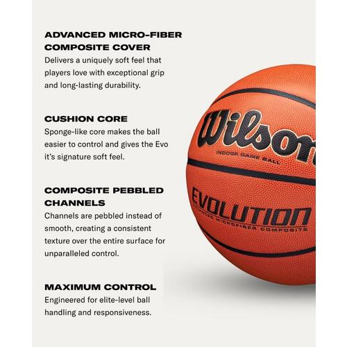 When you focus on getting better, and not just on getting results, success takes care of itself. That is why the Wilson Evolution Game Ball is the preferred basketball in high schools across the country. Every part of this ball, from the unparalleled soft-feel, composite cover to the composite pebbled channels, provides an exceptional grip and performance for those who aren't satisfied with being satisfied. Suited for indoor use, the Evolution is approved for competitive play at all levels including youth and high school.