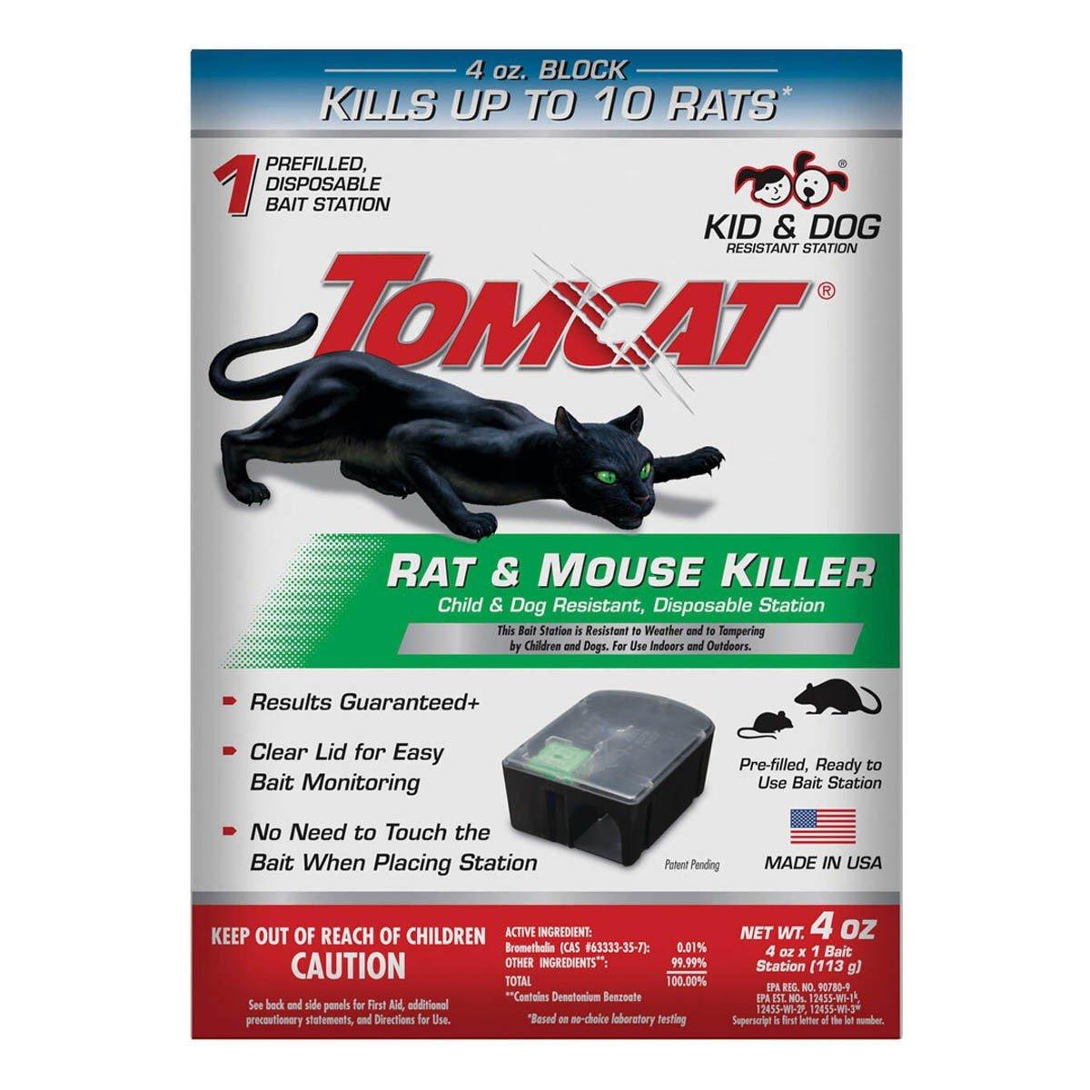 Tomcat rat & mouse killer child & dog resistant, disposable station effectively kills up to 10 rats with 4 oz. bait block while providing the highest level of station security. Resistant to weather and tampering by children and pets, the disposable station gives rats easy access to bait and keeps fingers and pet paws out. The bait station is also weather-resistant, making it the ideal station for indoor and outdoor use. Follow all directions and restrictions on label when using the bait station.